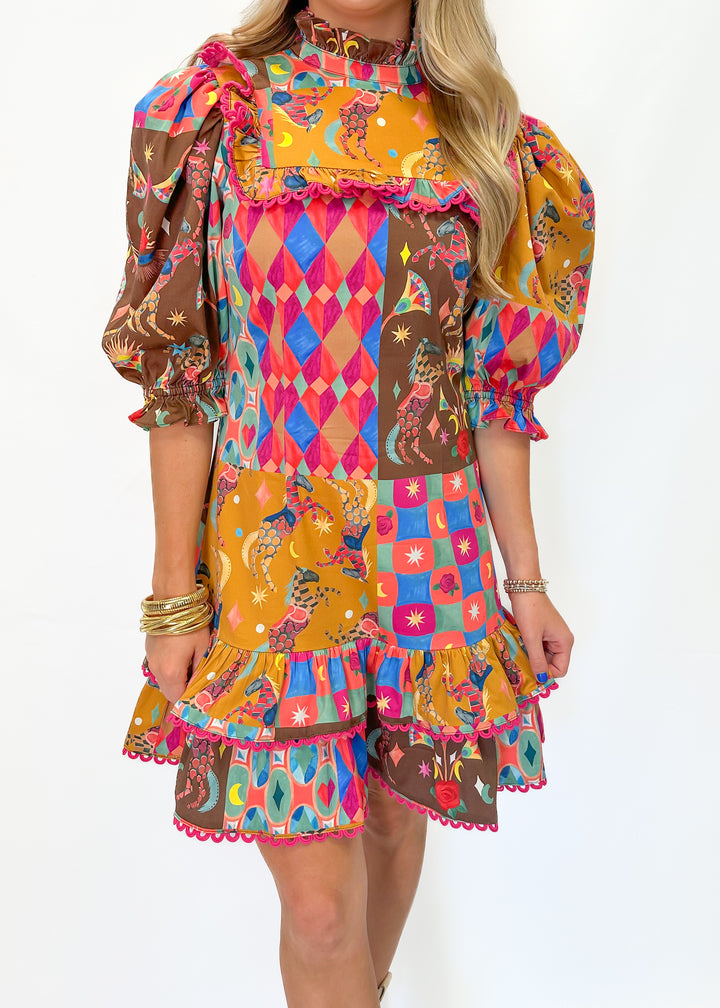 The Alden Adair Murphy Dress in Triple Crown print is the perfect addition to your wardrobe. Featuring a sophisticated and classy style with pink trim detailing, bubble sleeves, and a flare bottom, this dress provides a pop of color while remaining versatile for any occasion, from work to date night.