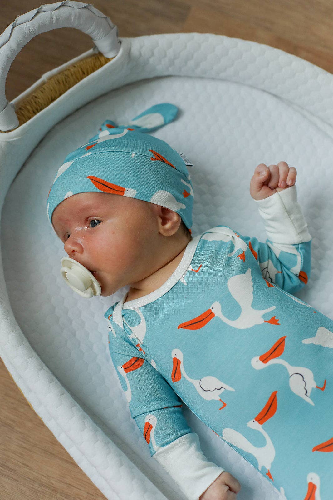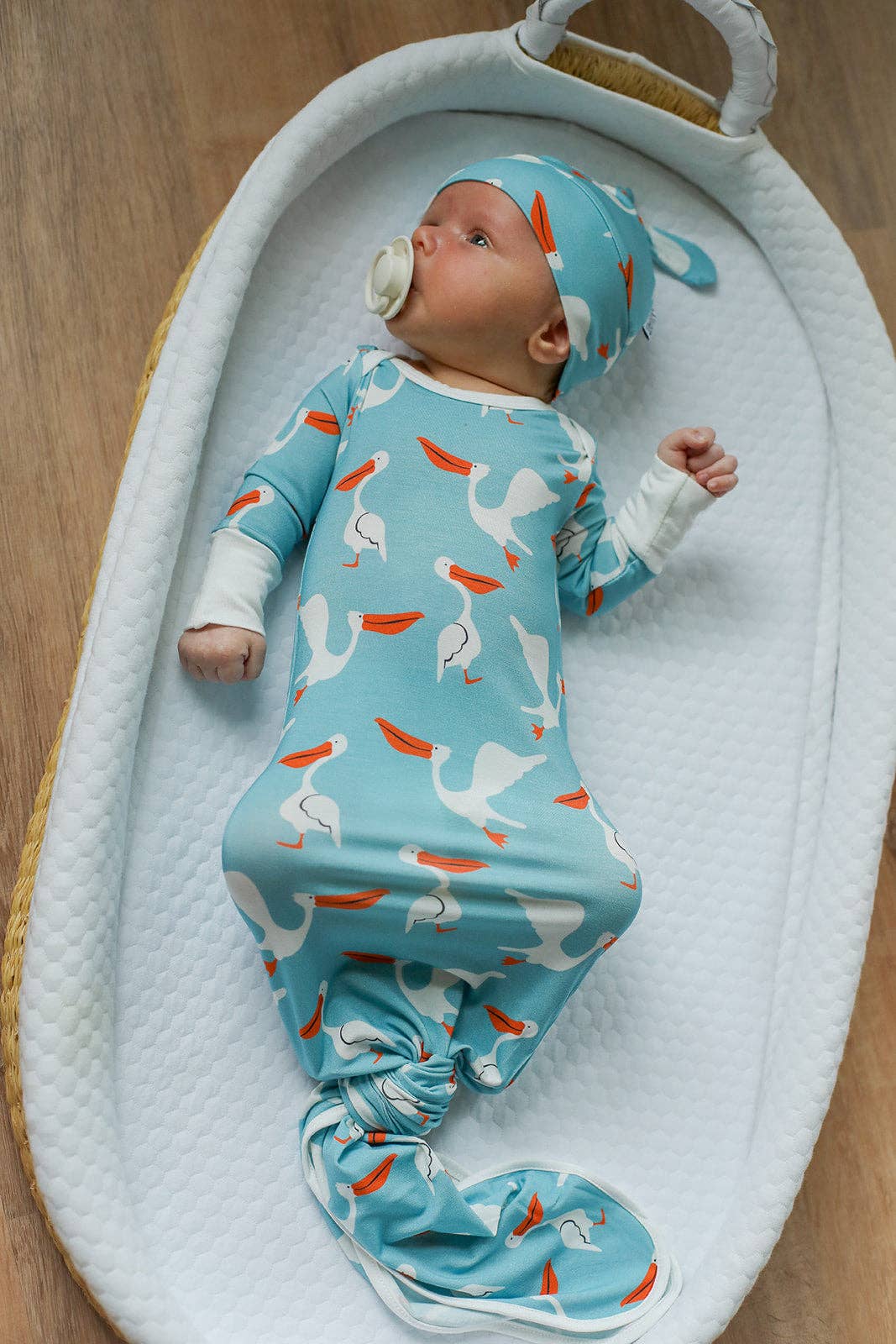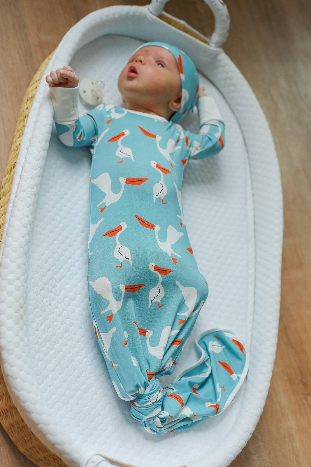 Our knotted gowns are made of the softest material - viscose from bamboo! So gentle on skin and perfect for any season, which is great because these gowns last much longer than your average pajamas due to bamboo's amazing stretch abilities. Knotted Gowns are Newborn size. This Pelican print was created to be a gender neutral classic design that's sure to become a bedtime staple for your little!