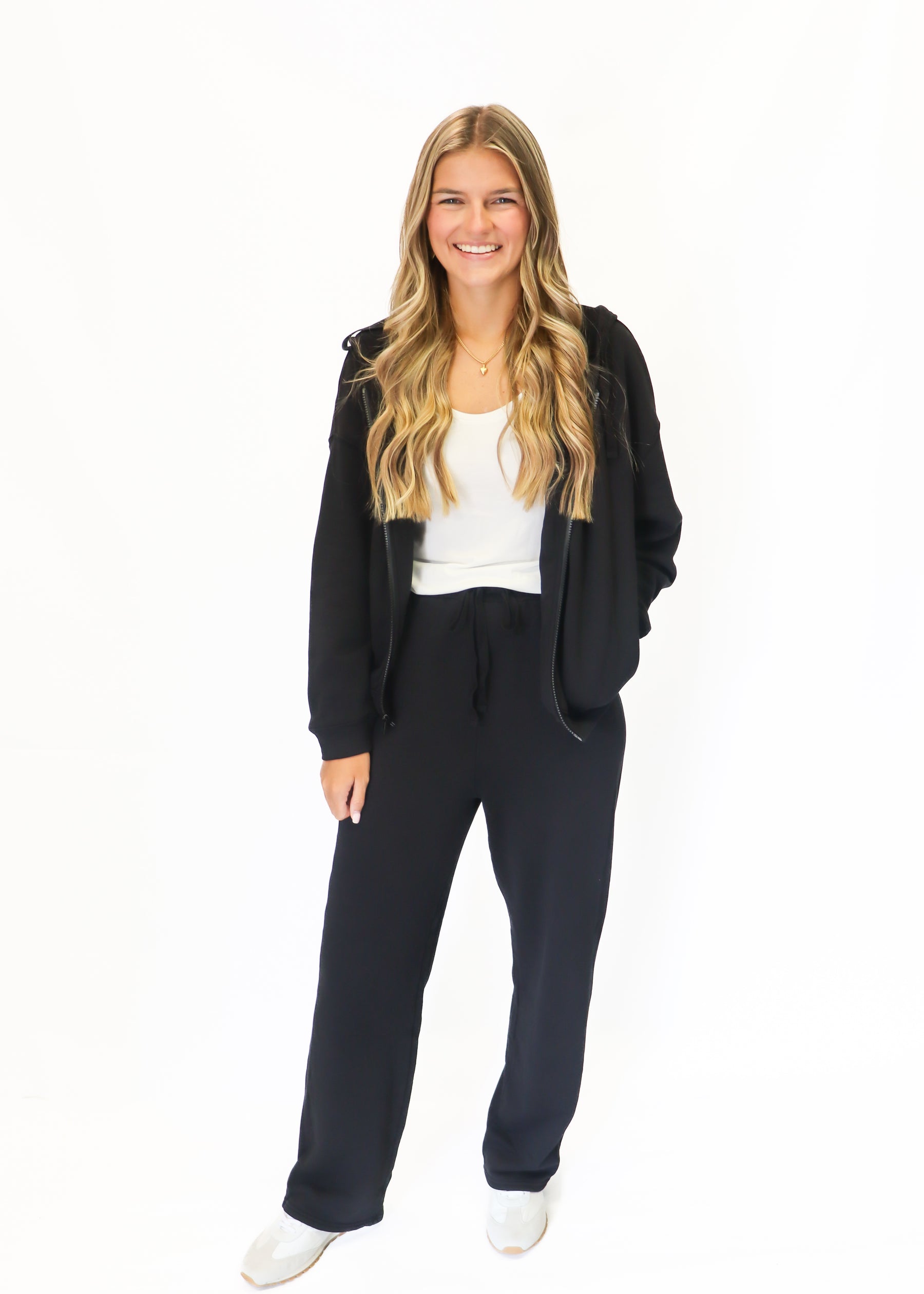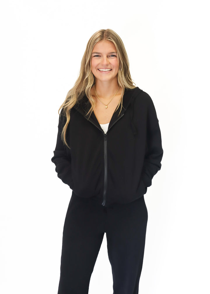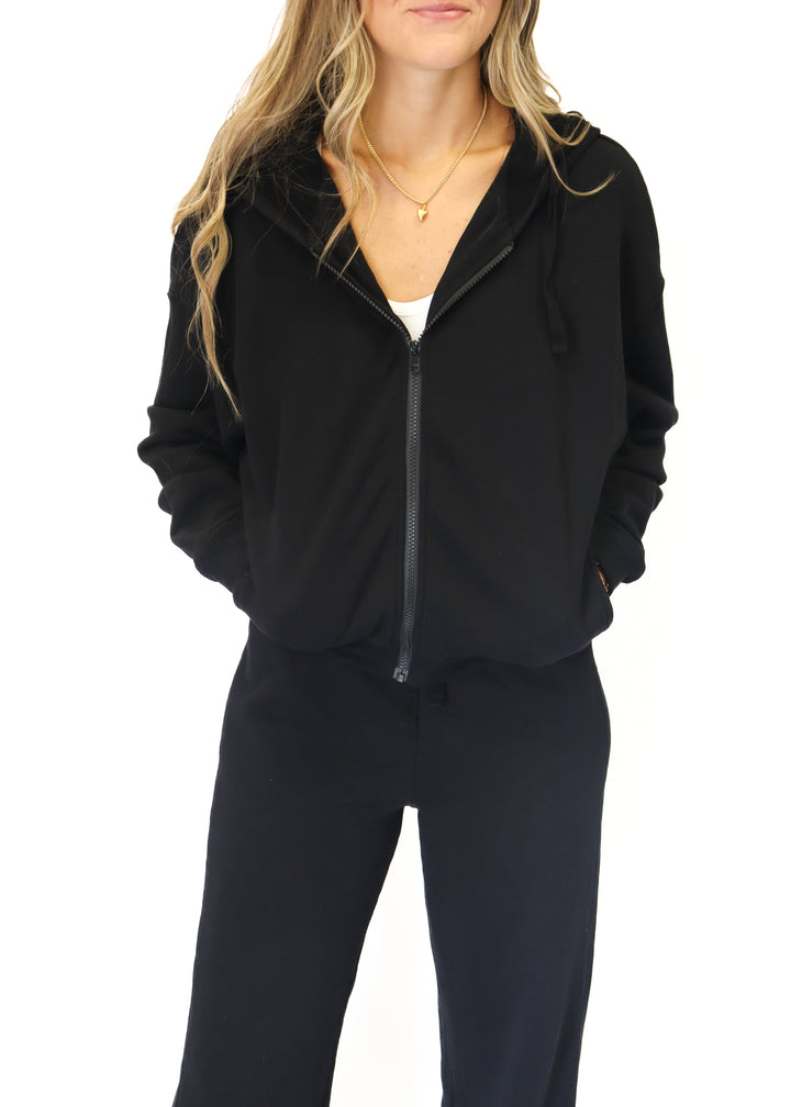 Expertly crafted, the Bobi Slouch Zip Front Hoodie in classic black offers timeless style and comfort. Its slouchy fit makes for a versatile and effortless ensemble. Stay cozy and fashionable with this must-have addition to your wardrobe. This hoodie pairs back with the matching high-waisted sweatpants in black by Bobi.