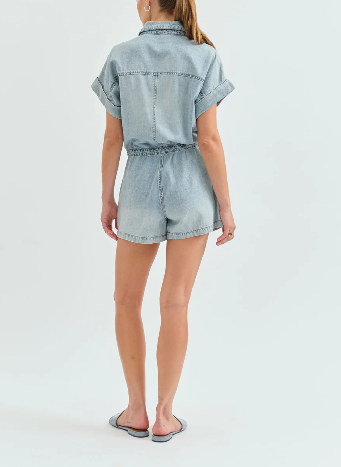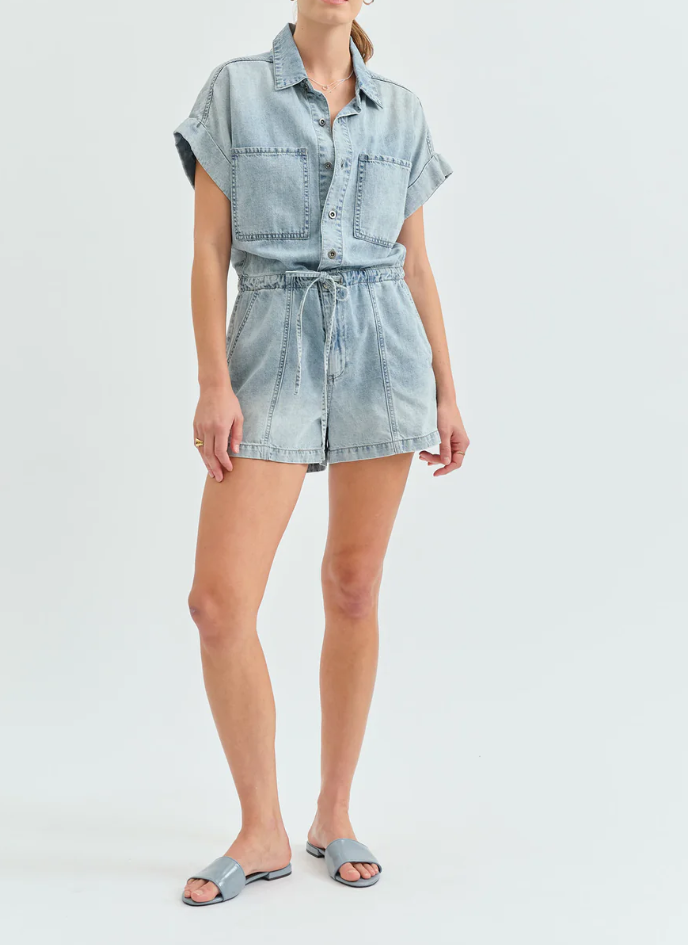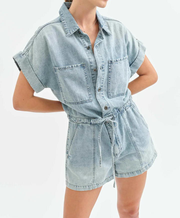 The Surfside Romper is designed for all-day wear. This light wash one-piece features a breathable, soft denim fabric that’s perfect for warm days. The adjustable drawstring waist lets you personalize the fit, offering both style and comfort with a flattering silhouette.