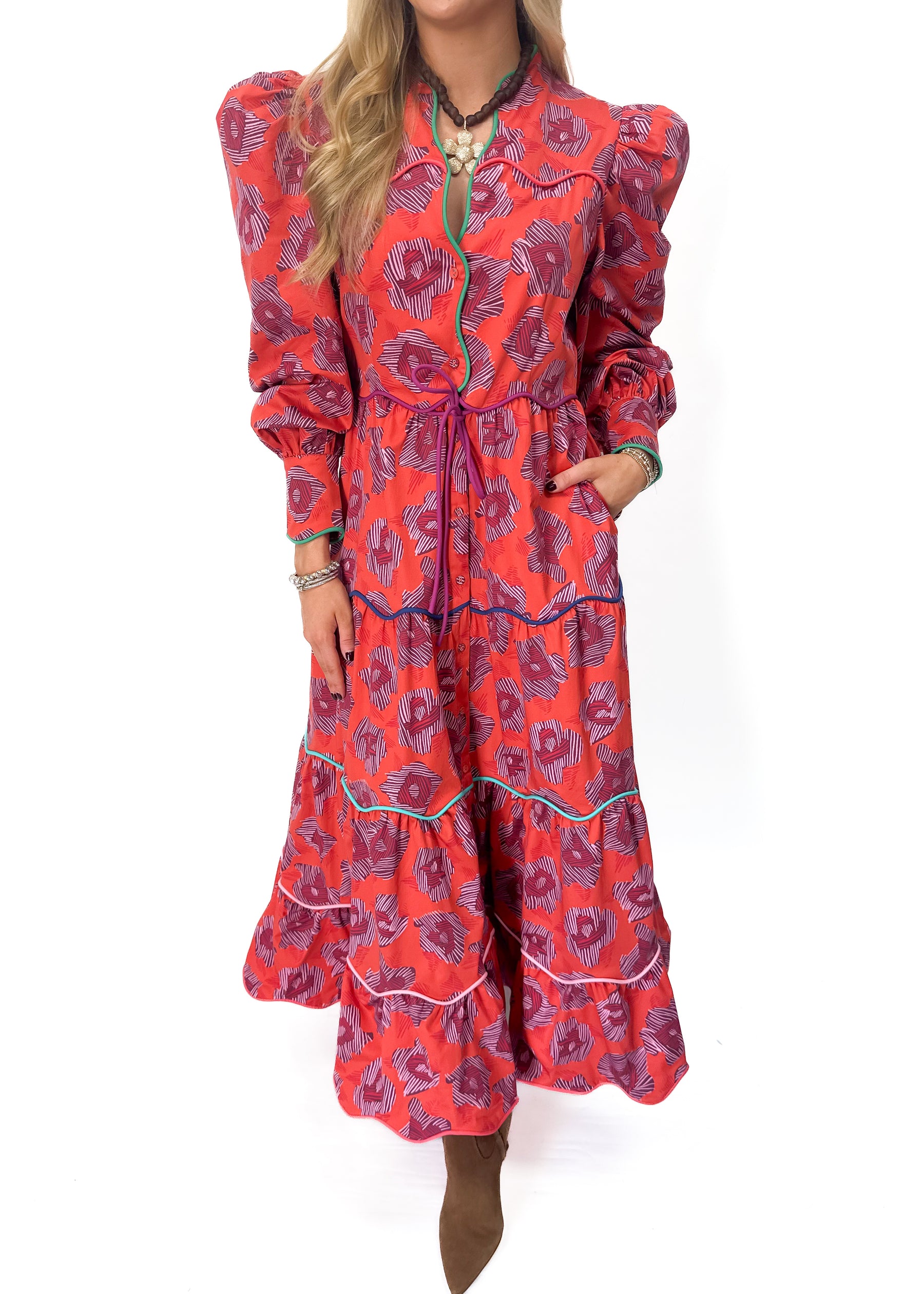 The Hope Dress Print is a reimagined house classic, refreshed with this season’s vibrant floral print. Featuring long puff sleeves, a plunging neckline, and tiered ruffles, it maintains its iconic silhouette while embracing a playful new energy. The waist tie enhances definition, and it's button-down nature makes this the perfect piece for a more casual outing.