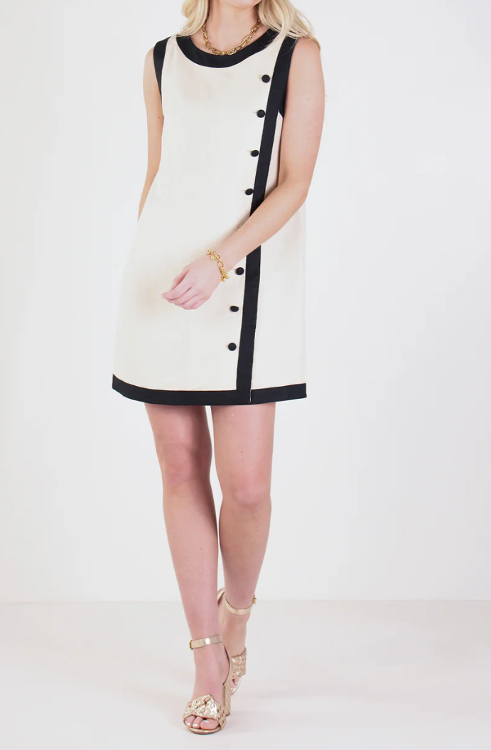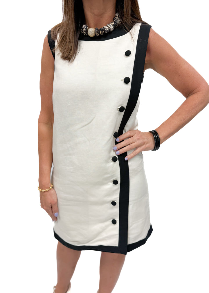The Tory Tunic Dress in Birch is the wardrobe staple your closet’s been waiting for. Crafted from luxurious linen, this dress showcases a sleek straight silhouette, a refined round neckline, and a row of covered buttons that trail down the front side for a touch of polished charm. Framed with contrast trim in classic black and ivory, it’s a neutral go-to that transitions seamlessly from day to night. Dress it down with sandals and sunnies or elevate it with heels and statement jewelry—the styling possibilities are endless!