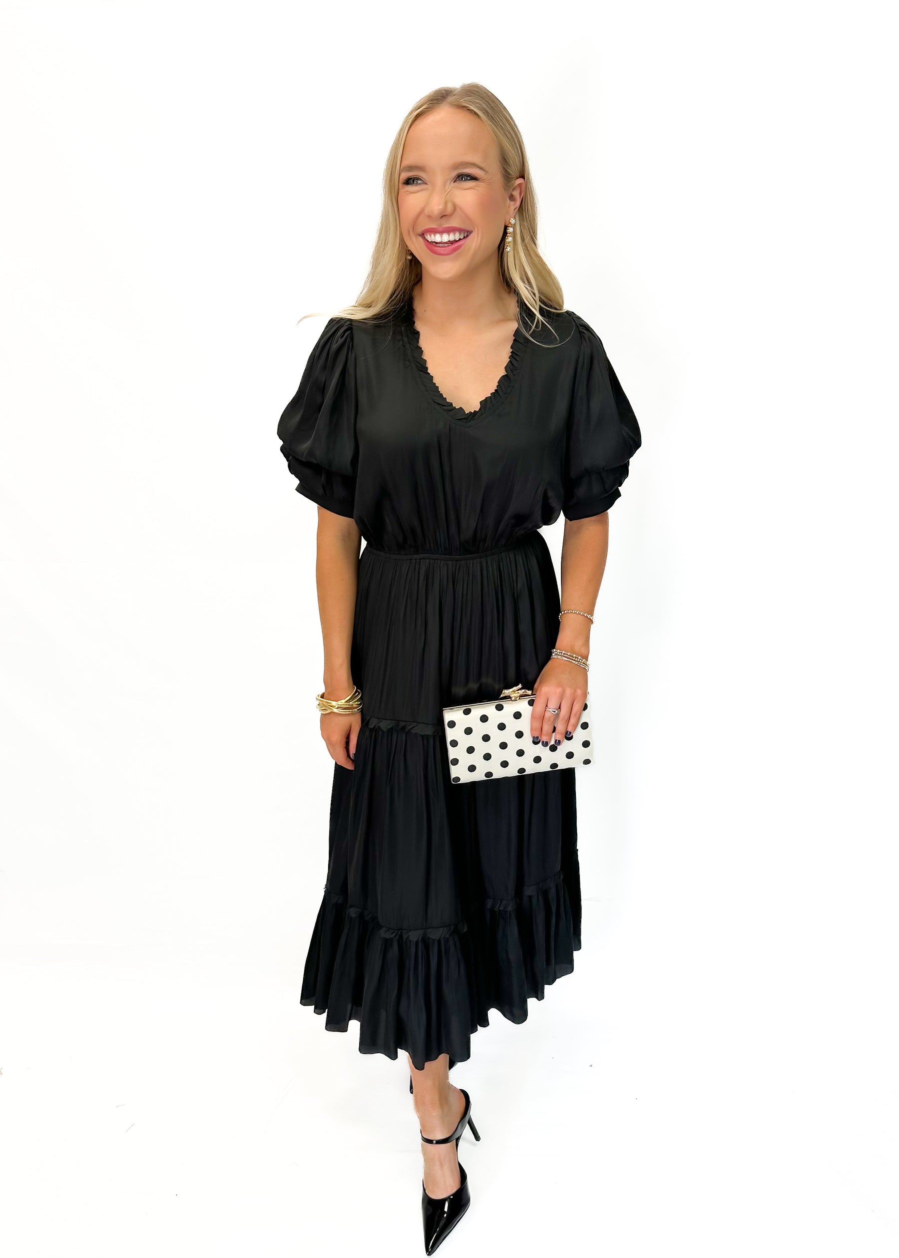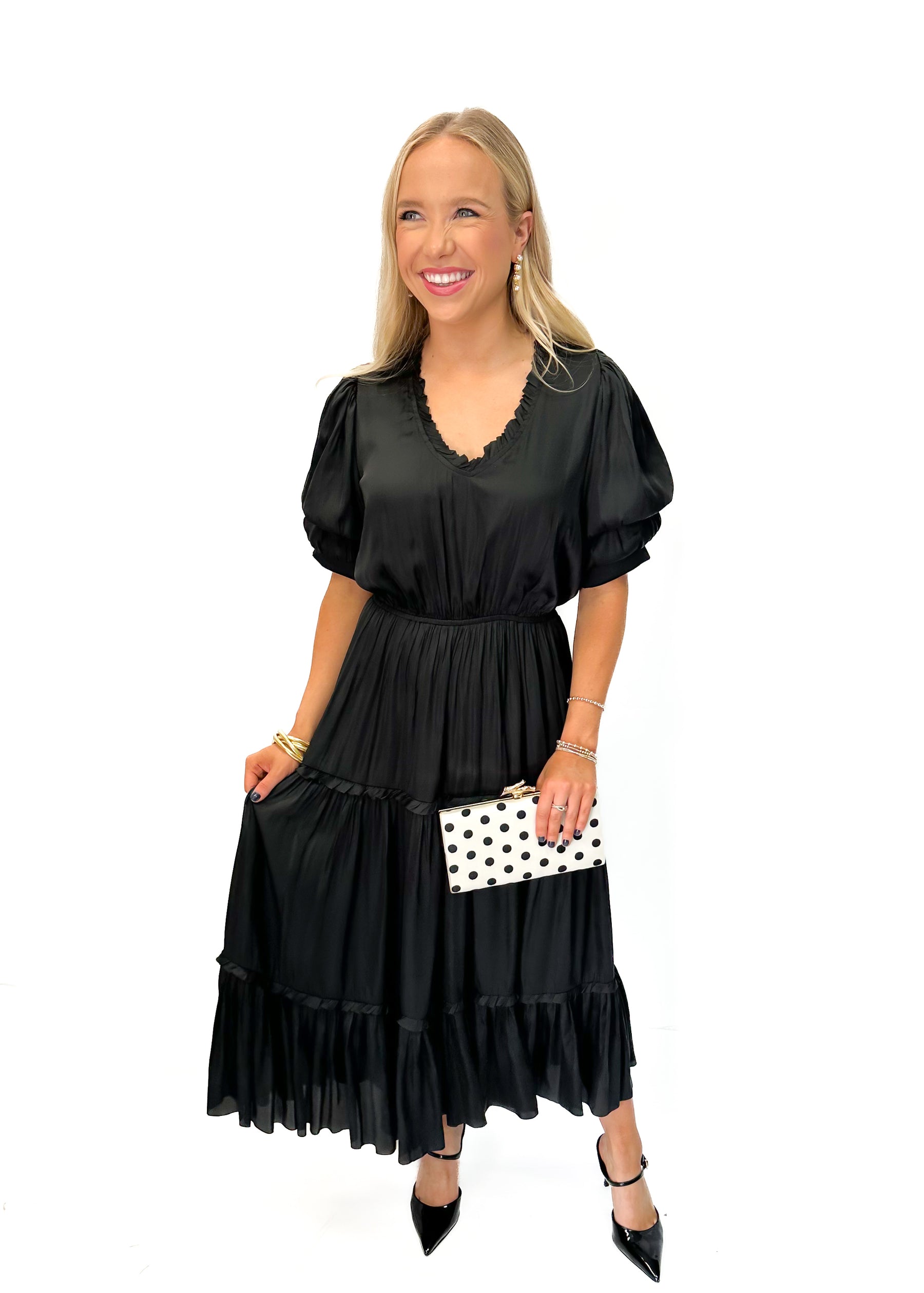 The Helena Dress overflows with luxury, elegance, and sophistication. It features a V-shaped neckline with delicate ruffles and tiered bubble sleeves. The elastic waist provides a comfortable and flattering fit. Made from a solid color satin fabric, the midi length dress is completed with a tiered ruffle trim skirt.