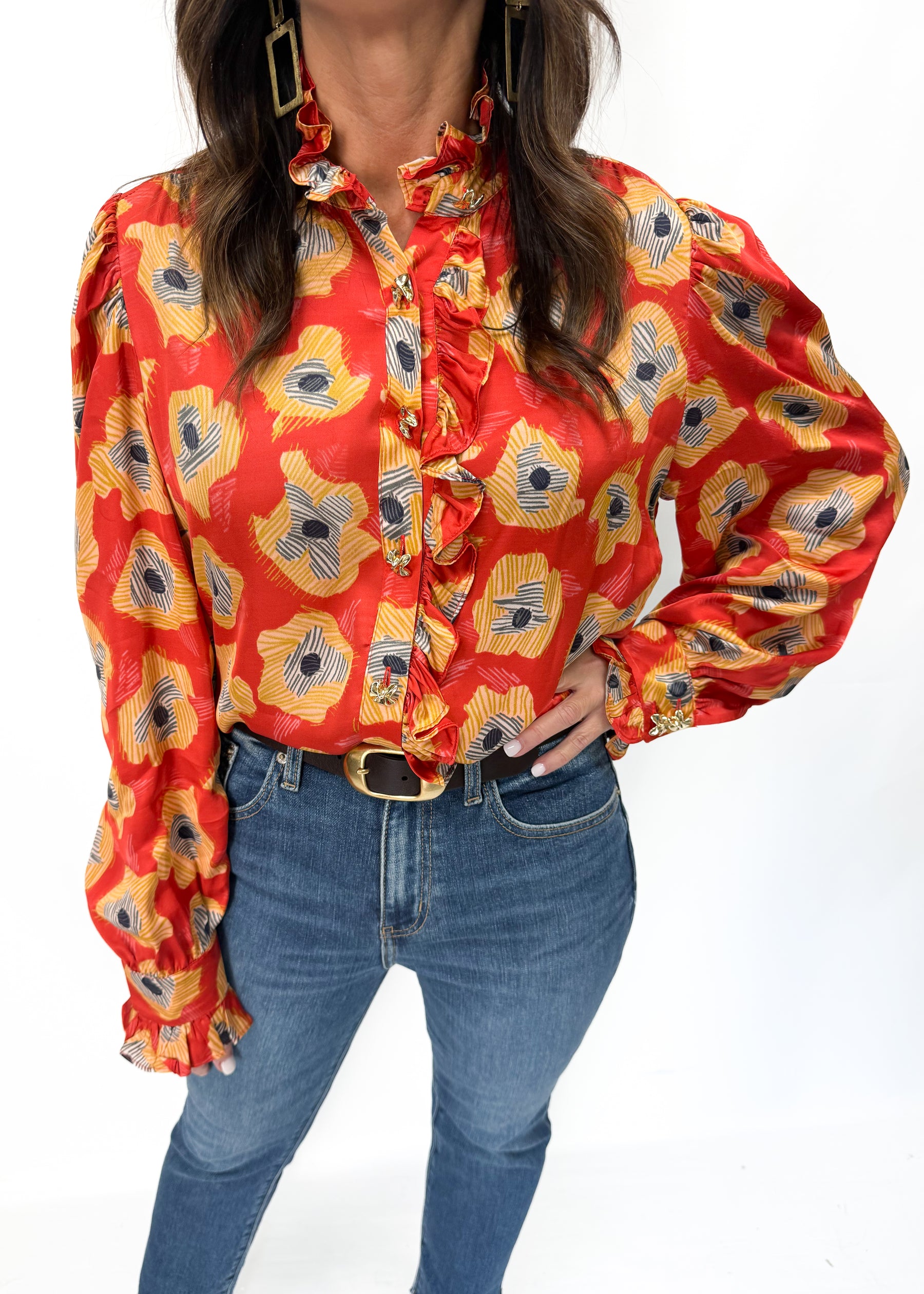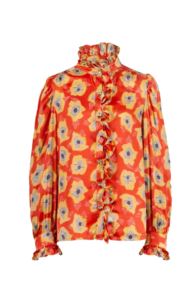 The Aurora Top brings romantic drama to everyday style. Crafted from lustrous silk in a vibrant sunset-orange base with oversized yellow poppy motifs, it features cascading ruffles along the neckline and down the front, plus voluminous puff sleeves with gathered cuffs. Pair it with tailored trousers for an elevated day-to-night look.