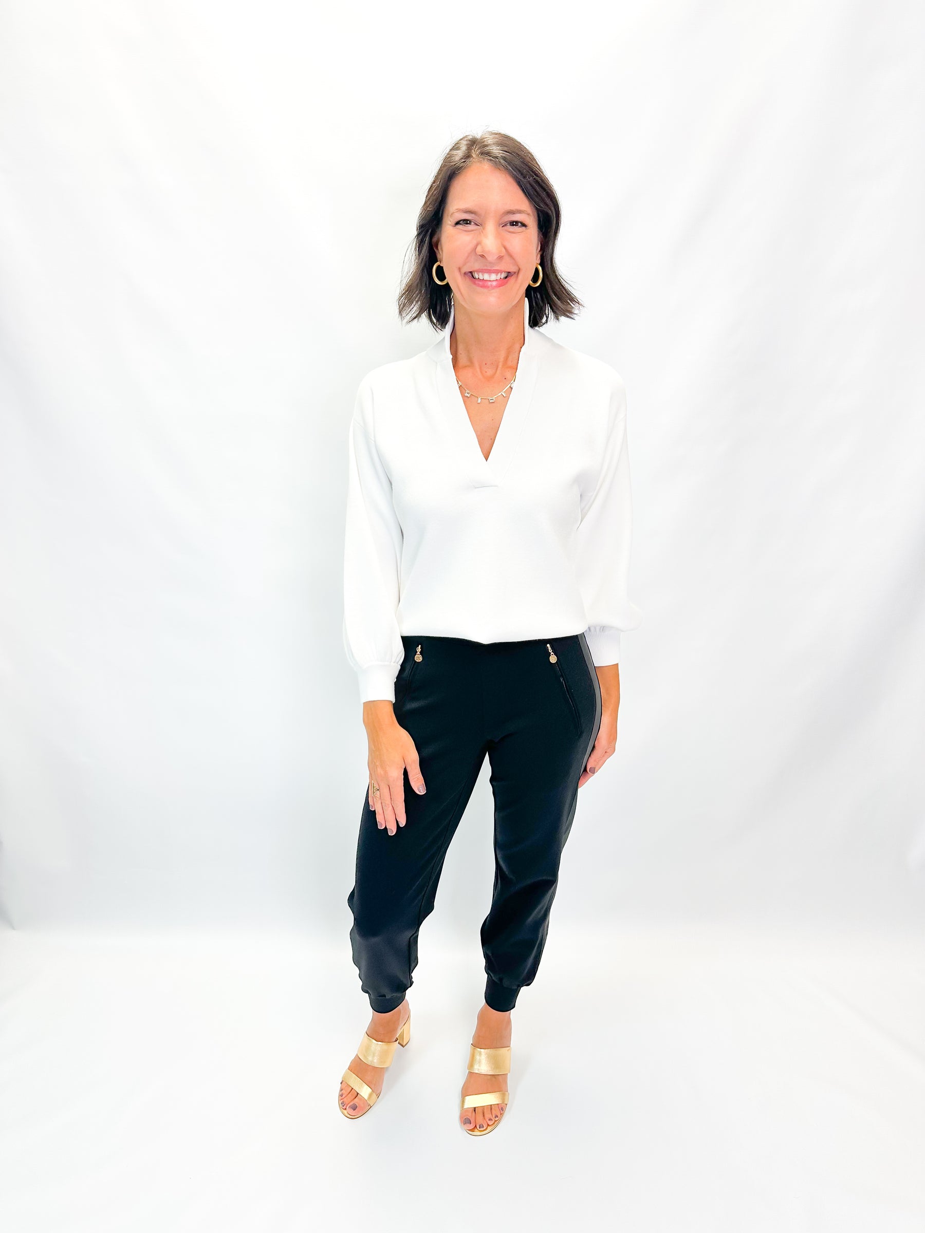The Downtown Jogger is our go to for all things comfy & chic, the perfect combination of sophisticated and casual. Made from our favorite Ponte fabric, with added feature of a vegan leather tuxedo stripe.