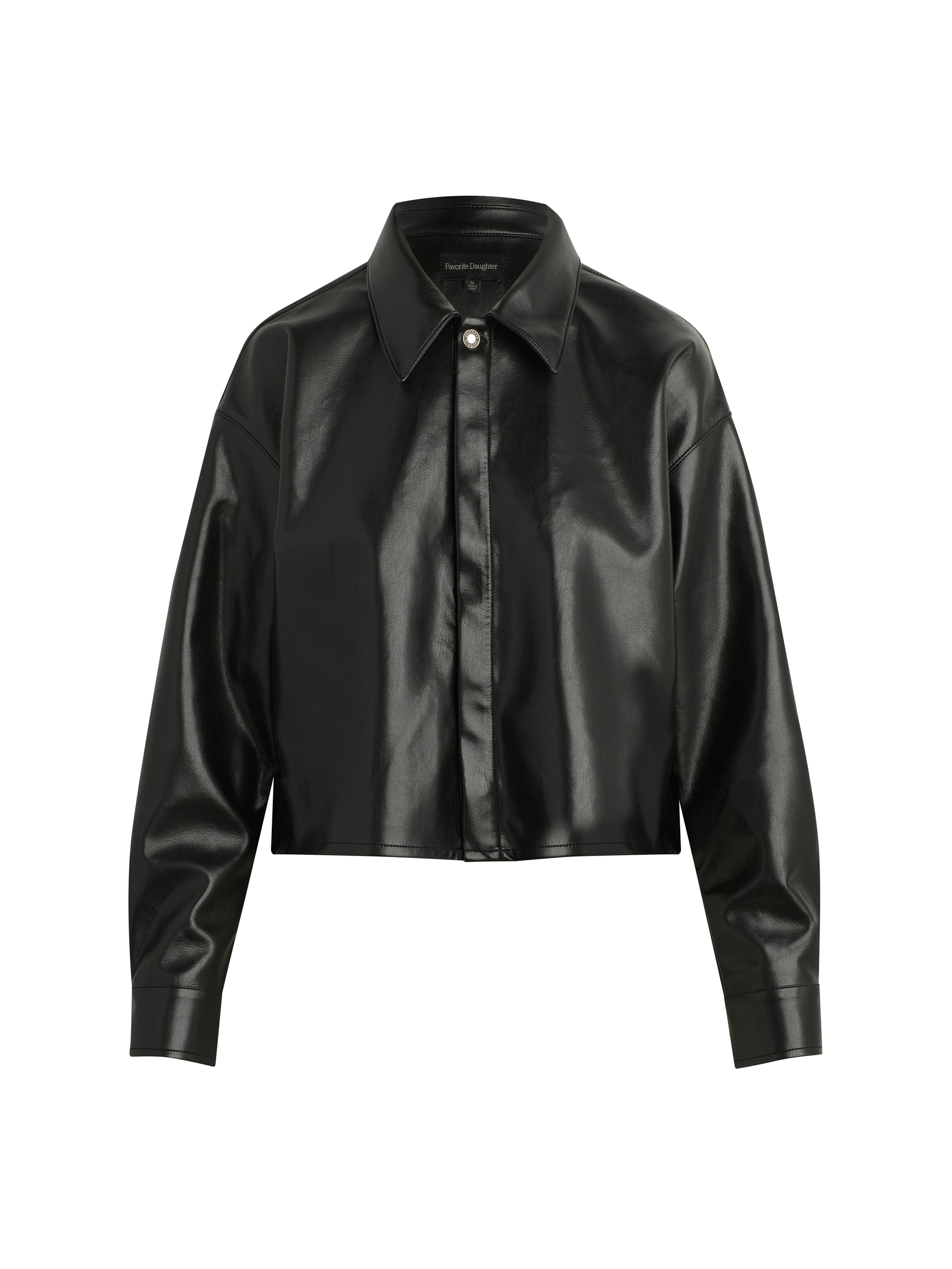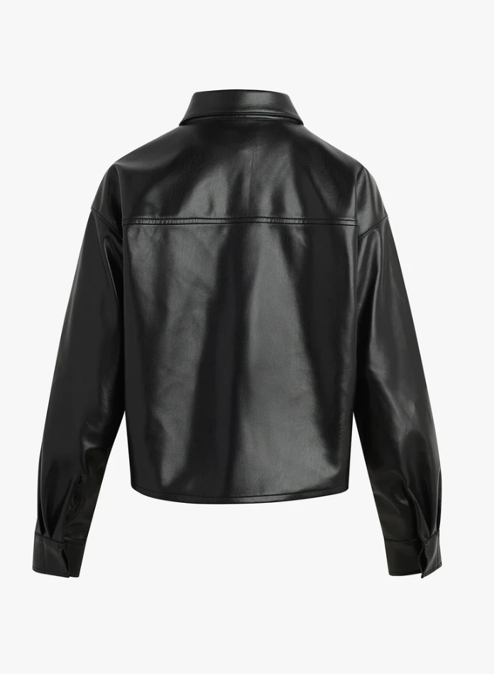 The Brady Crop Shirt in vegan leather is designed for a loose, oversized fit that hits just below the waist for the perfect untucked look. Pointed collar, hidden front buttons and dropped shoulders are standout features.