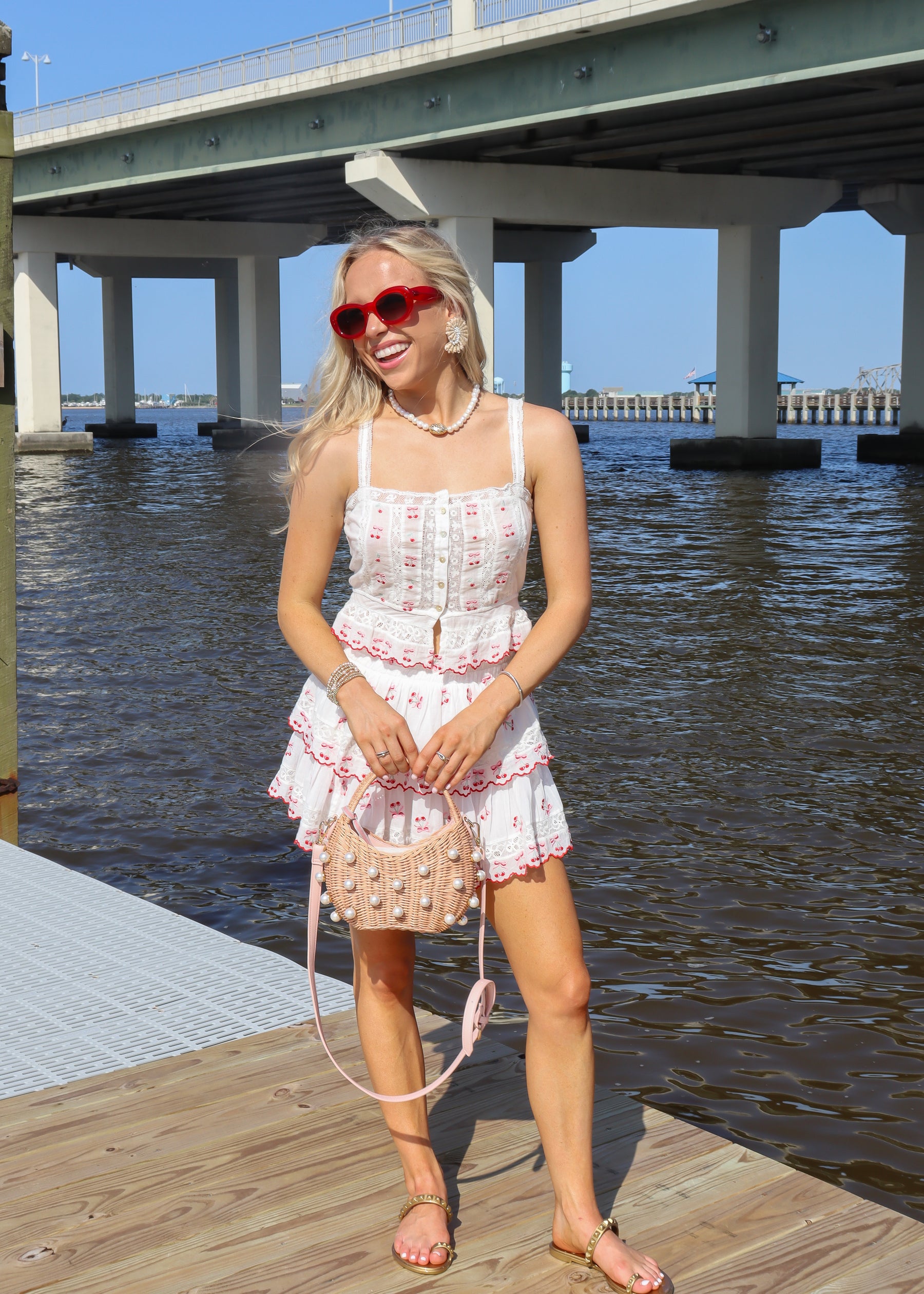 The Vietta Top returns as part of our America’s Sweetheart Cotton Collection. This charming top debuts with dancing cherry embroideries all over and a custom developed scallop hem detail. This fitted, Victorian-inspired cami top comes cropped with a center front placket designed with intricate laces all over and floral embroidery detail. The piece features thin straps, a square neckline, buttons down center front, and a flirty peplum hem.