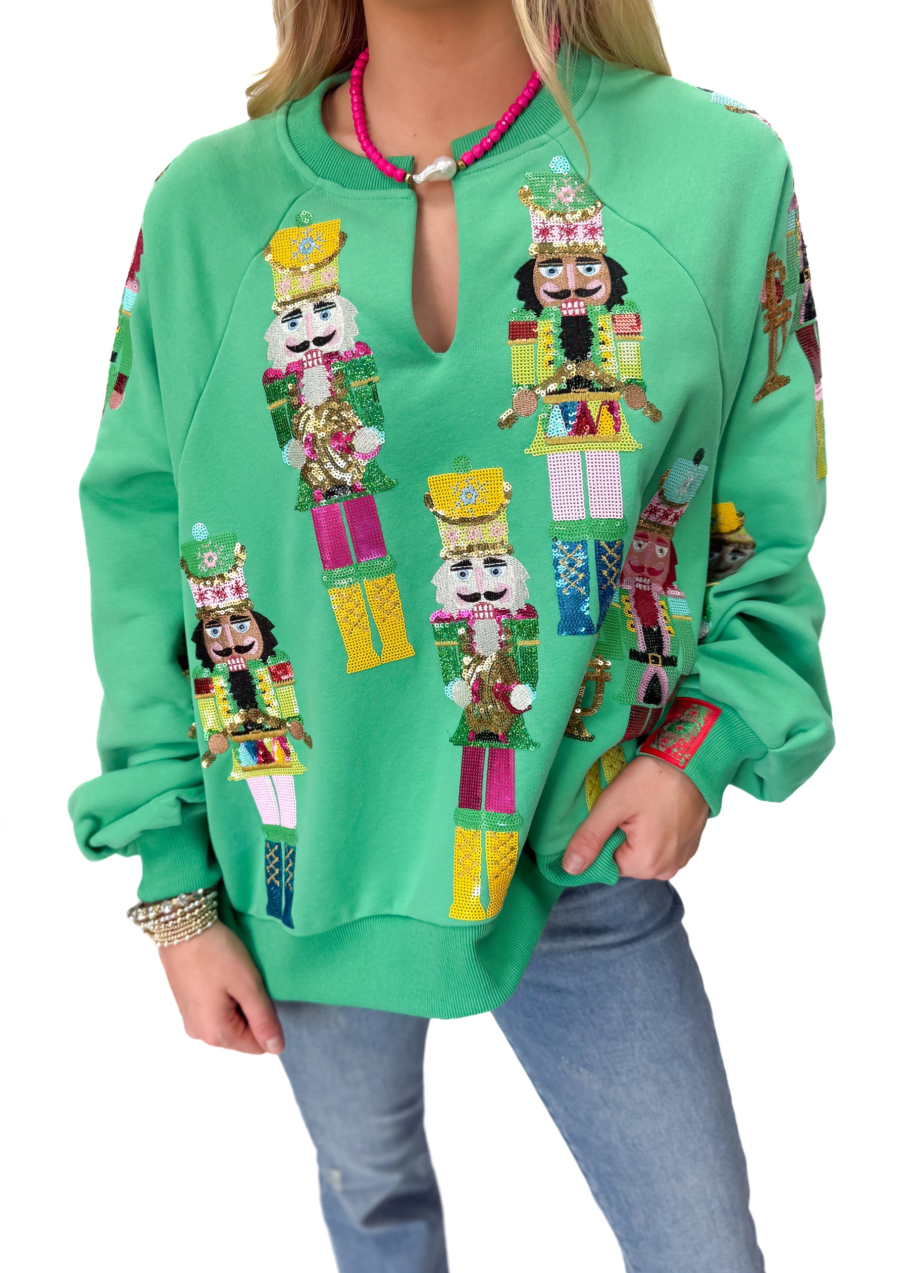 Celebrate the season in style with this green Nutcracker sweatshirt, featuring a unique split neck design for a modern twist on festive comfort. Perfect for cozy winter days or holiday gatherings, it blends holiday cheer with everyday wearability. Embrace the spirit of the season while staying warm and looking effortlessly stylish.