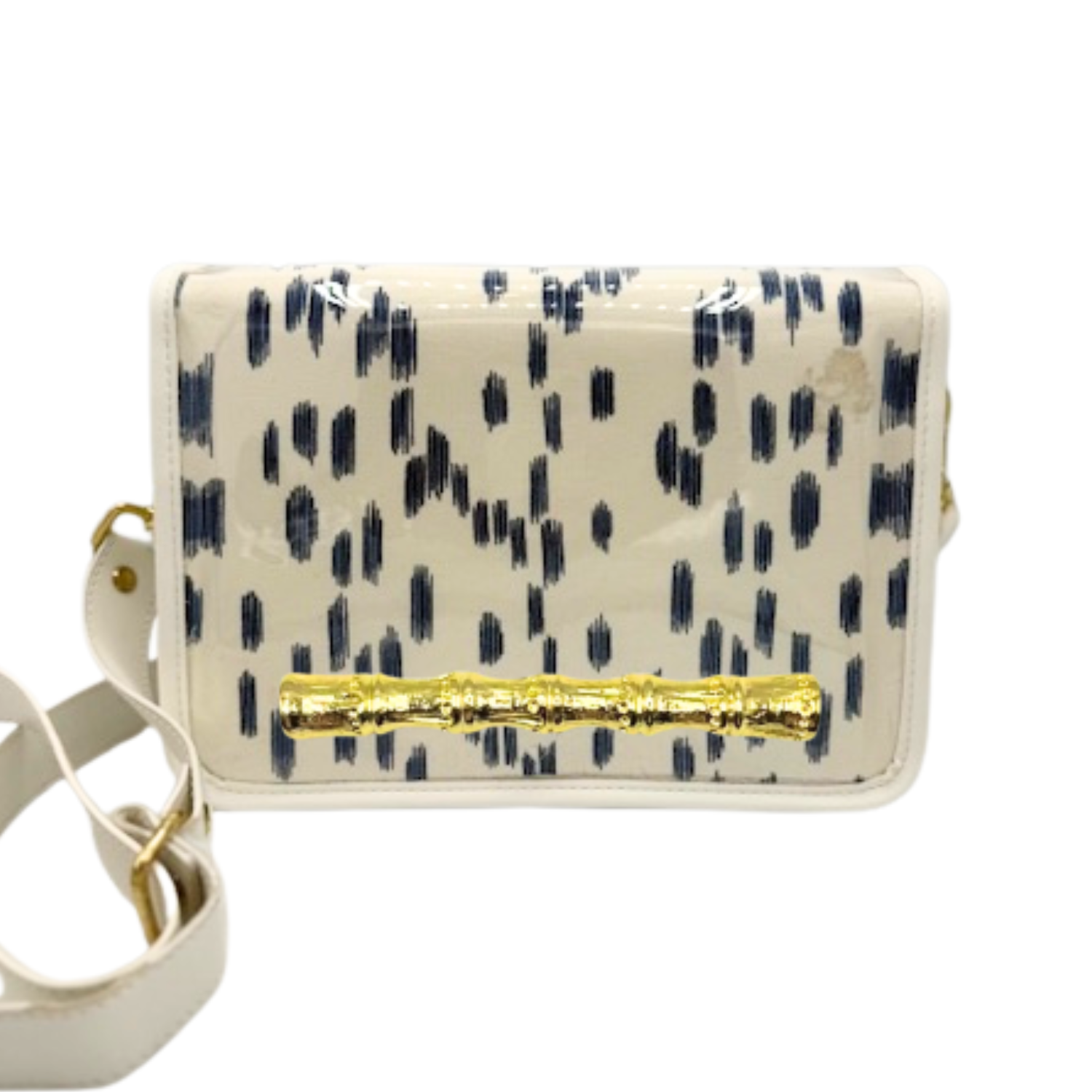 Add a playful yet chic touch to your game day outfit with this unique crossbody clear bag. It features a blue les touches design with a gold bamboo stick hardware. The removable faux leather strap is adjustable to act as a traditional shoulder strap or as a crossbody. This bag meets most standard stadium size measurements.