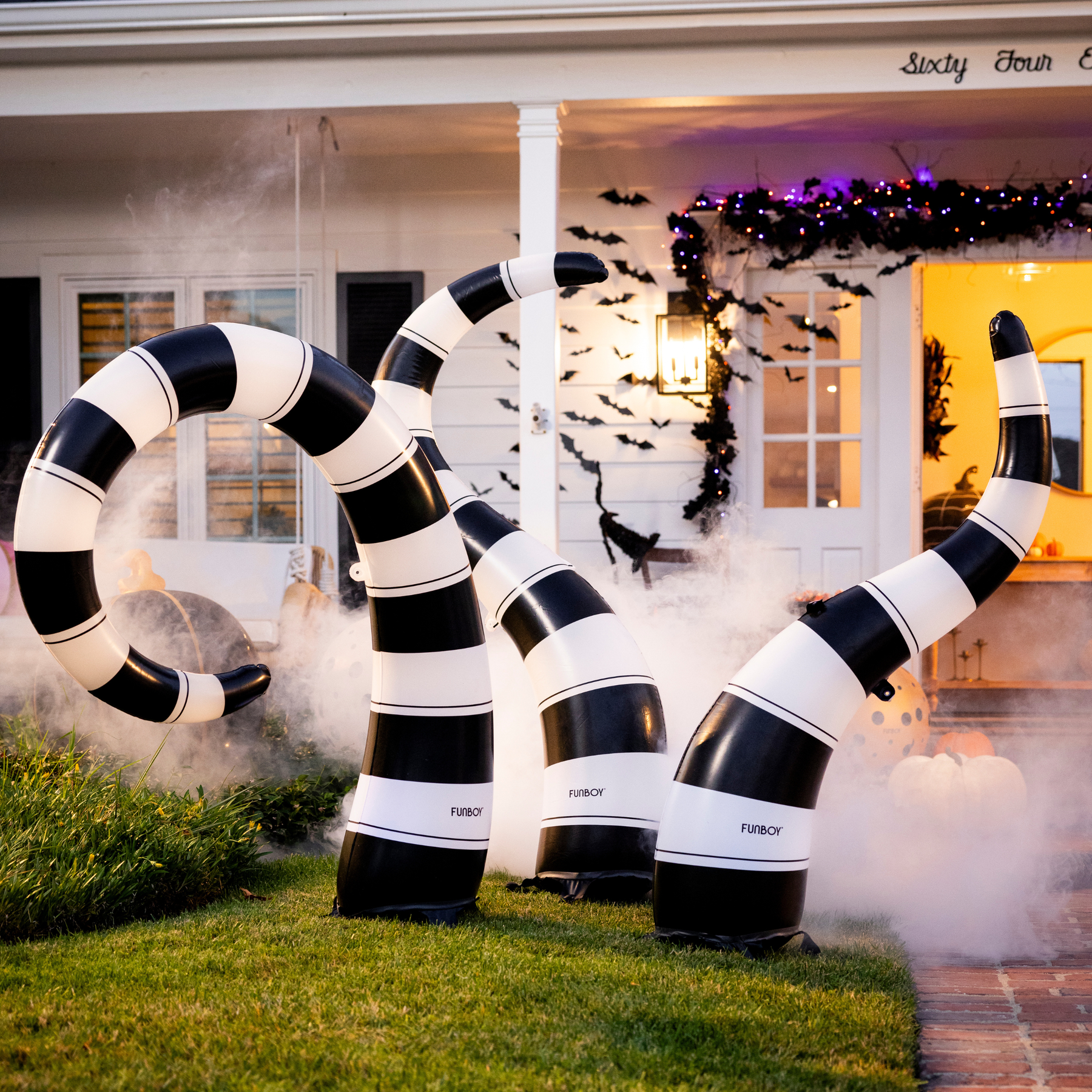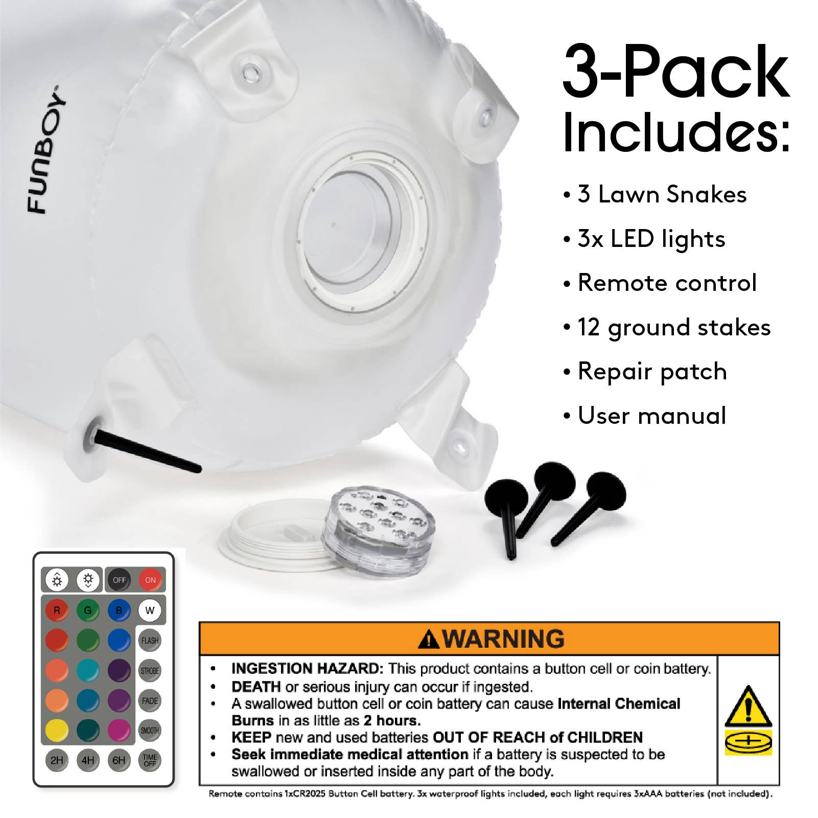Creep it Real. Transform your lawn into a slithering spectacle with FUNBOY’s Light-Up Inflatable Yard Snakes. These black and white snakes emerge from the ground, casting a glow that changes colors with the click of a remote and the included bright battery operated LED lights. Each worm requires 3xAAA Batteries (not included).