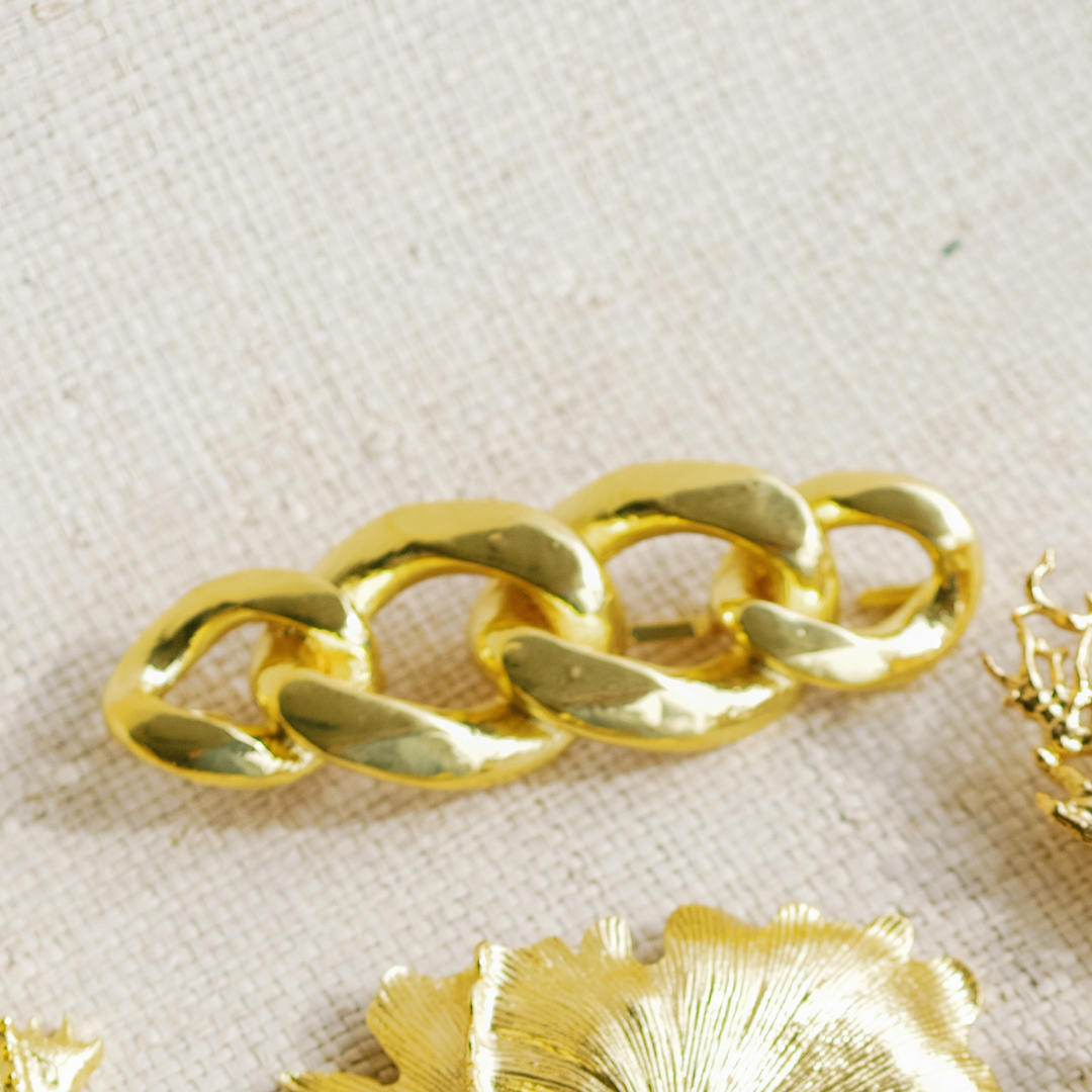 This buckle is an edgy classic - the gold chain link! It measures 5.25" x 2.5" This buckle is interchangeable with all of our stretch belt bands - BANDS ARE SOLD SEPARATELY.