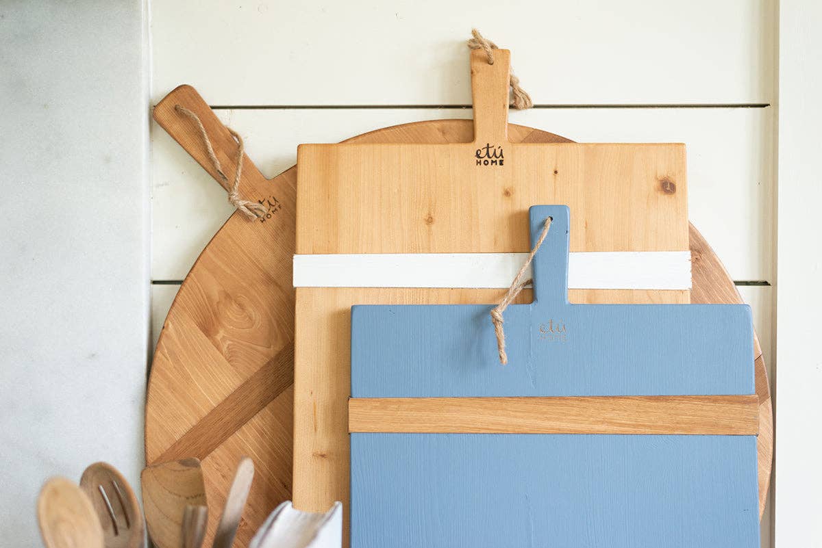 This reclaimed wood board is your new go-to for all serving, hosting, and decorative needs. For a modern spin, the serving board has been updated in a denim blue wax, a sure conversation starter. To ensure durability and timelessness, the wood platter is distinguished by two perfectly engineered strips of oak placed at ideal points to avoid the wood from warping. Perfect for serving cheese, fruit, bread, and charcuterie, and for use as a decorative kitchen accent behind your stove or hung on the wall.