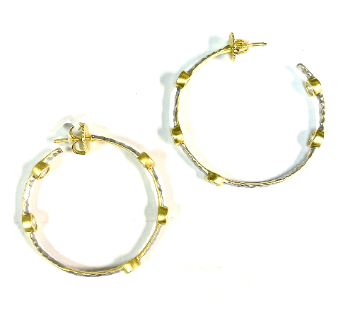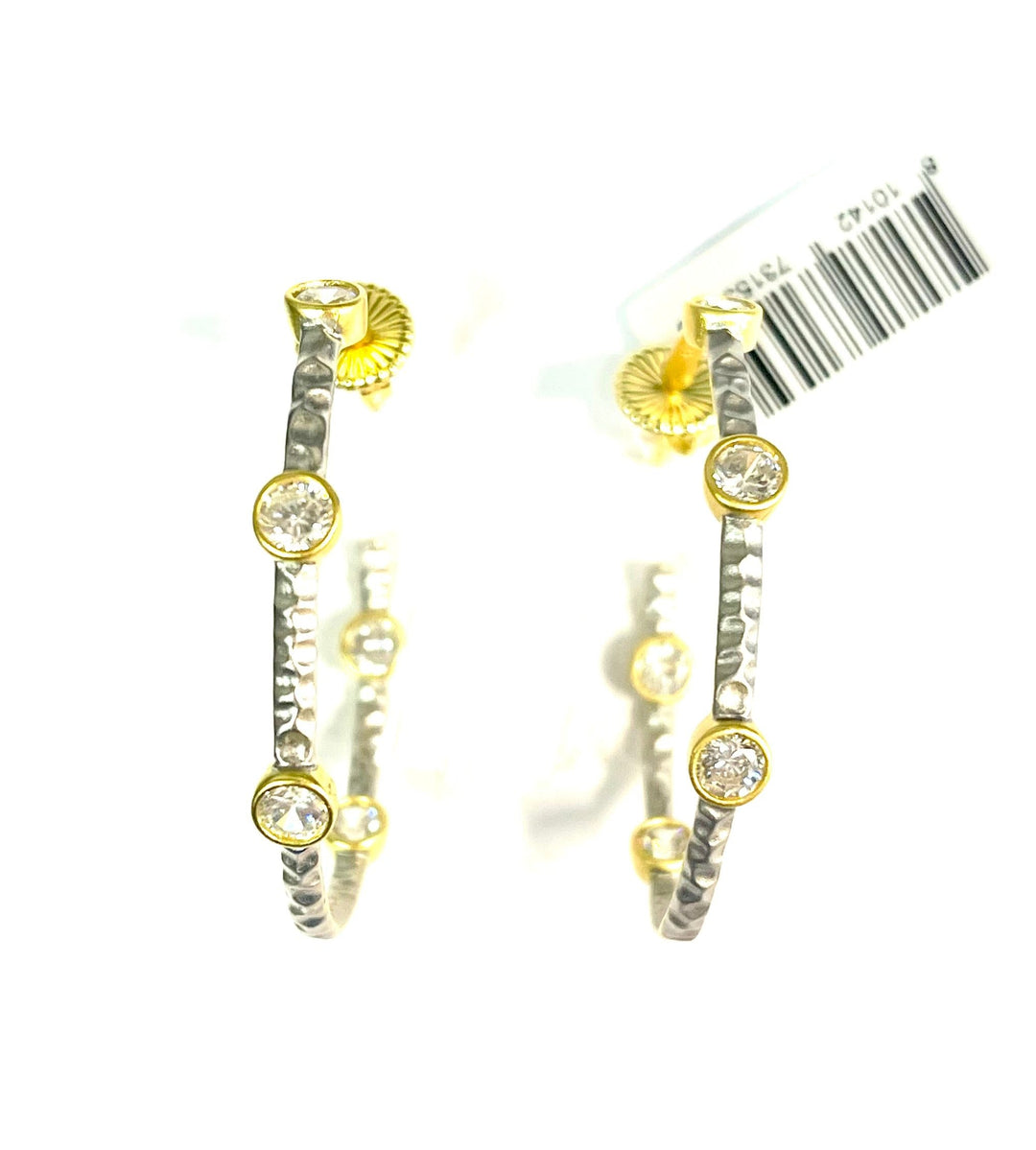 A statement hoop featuring our signature gold and silver design for an eye-catching moment. The Starry Night Hoop Earring is designed with hammered silver for industrial texture and adorned with sparkling stone stations framed with matte gold. Design details are featured both inside and outside the hoop for sparkle at any angle.