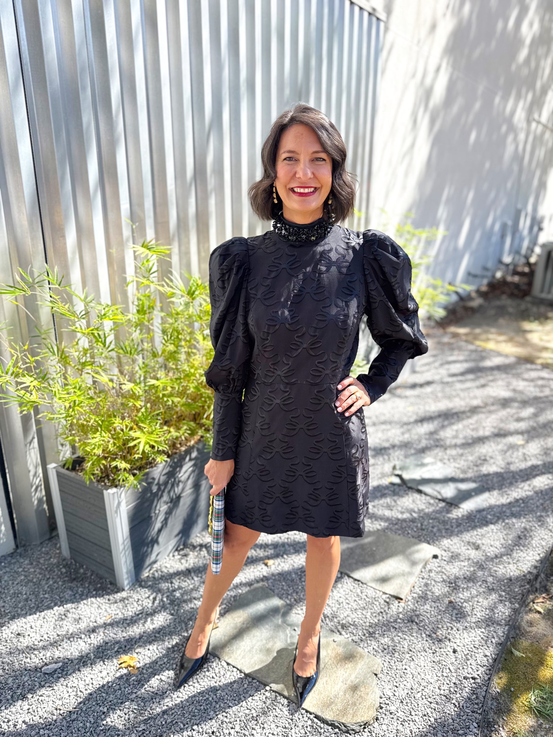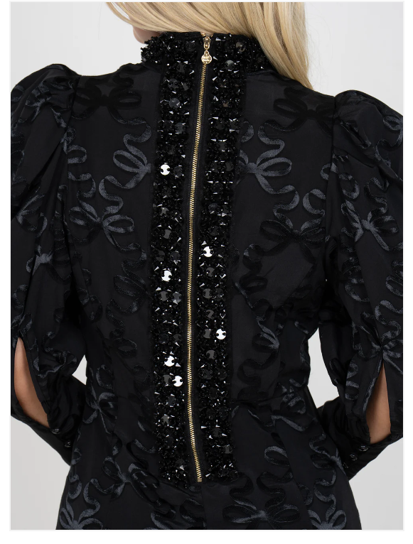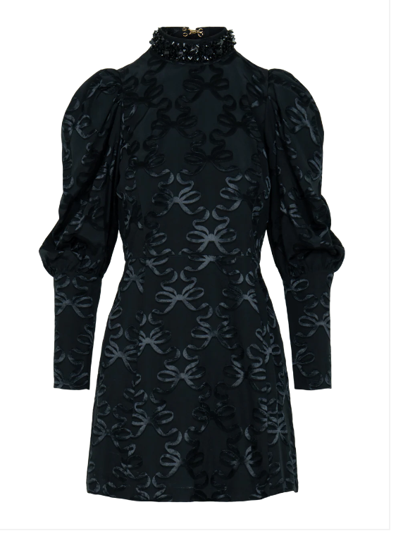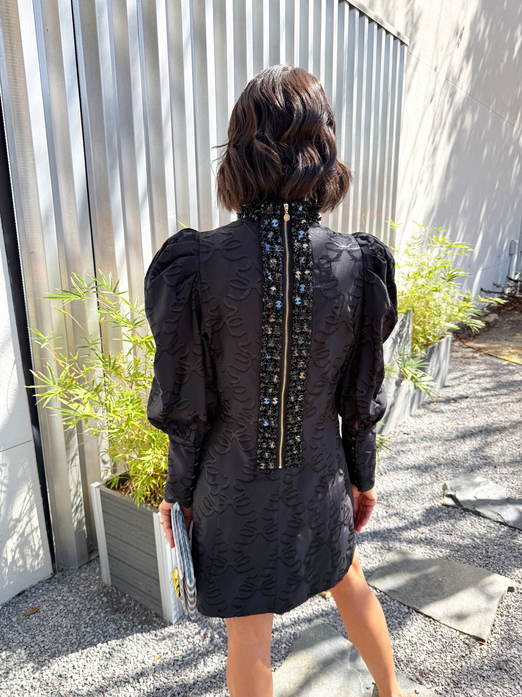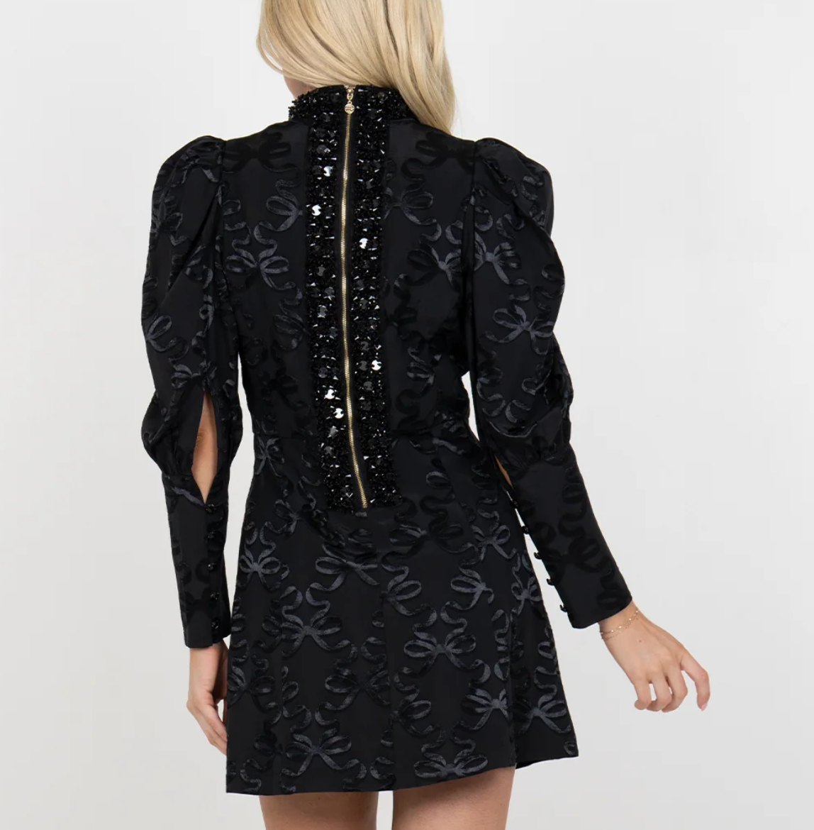 The Zoe Mini in Bow Lattice features a mock neckline and exposed back zip closure framed in monochrome jewel trim, and puff sleeves with tailored cuffs. Crafted in the bow lattice fabric, this mini brings depth and texture to a monochrome palette. With its sharp silhouette and refined embellishments, it’s a standout party-forward piece for the season.