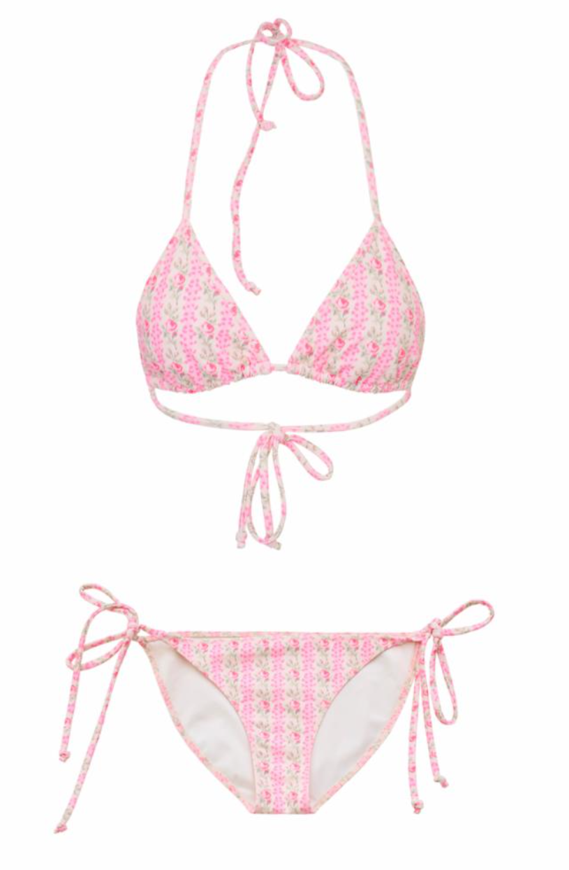 Love Shack Fancy's classic Harbor Bikini Set returns reimagined with a new pretty print. The sweet and sexy triangle top features a playful ruffle lining with interior bust seams. The print continues on the thin strings that tie comfortably around the neck and back. The bottom has a classic, revealing cut with string ties at each hip that make it adjustable.