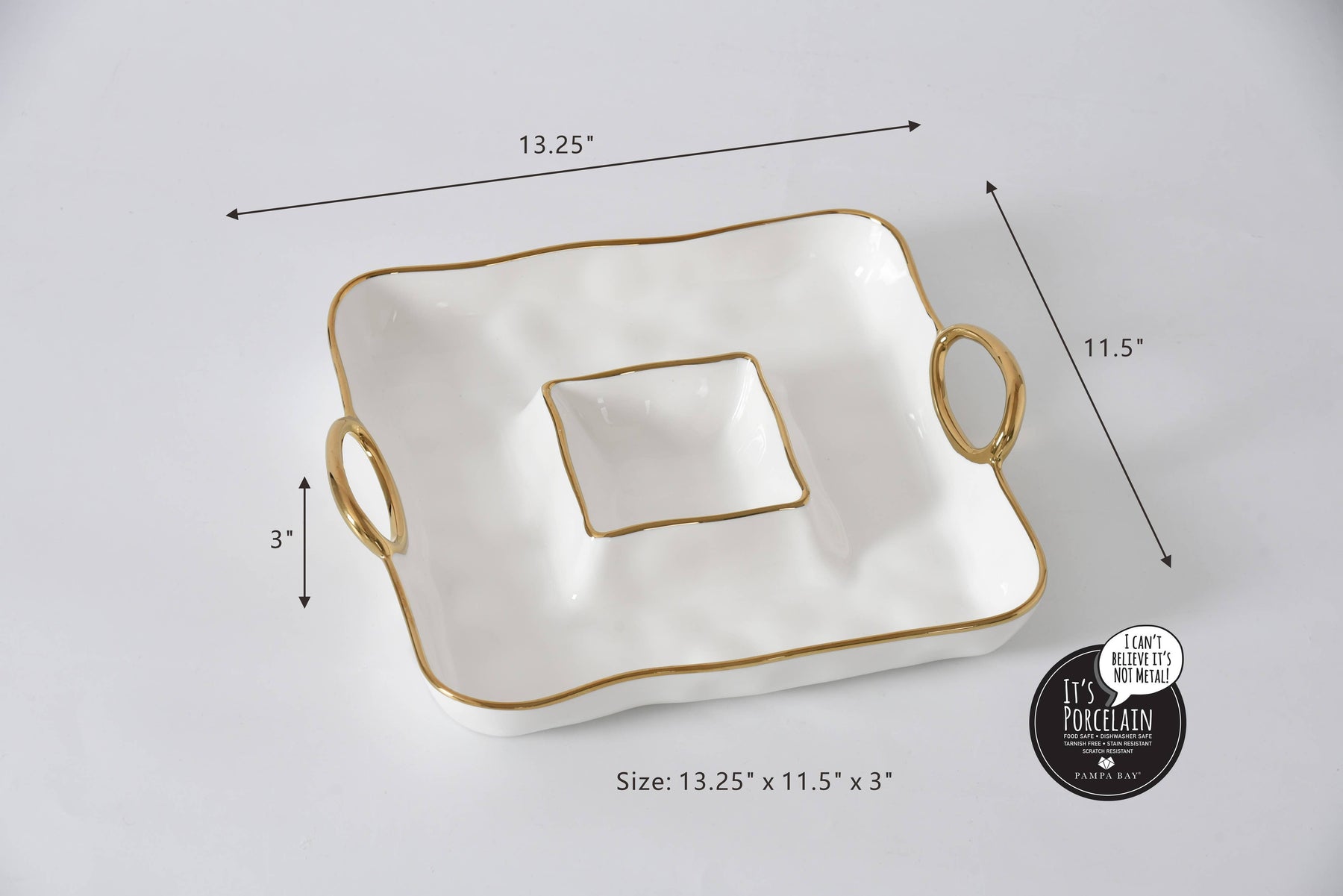 Square Chip & Dip from the Golden Handles. Perfect for any dip combo: hummus and pita, salsa and tortilla chips, veggies and ranch or our favorite berries and whipped cream! Gleaming white porcelain with smooth and graceful rim and handles in gold. Food safe. Dishwasher safe. Oven safe to 500°F/260°C. Easy Care.
