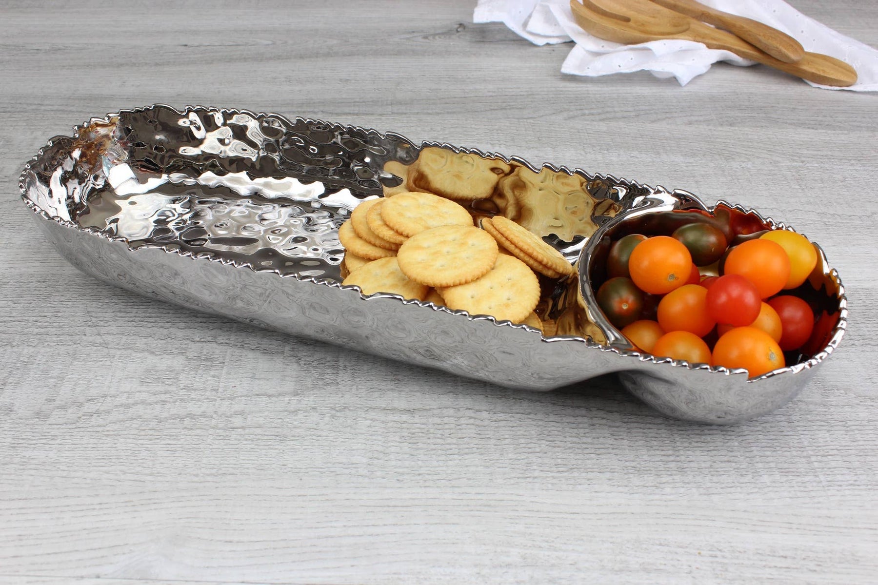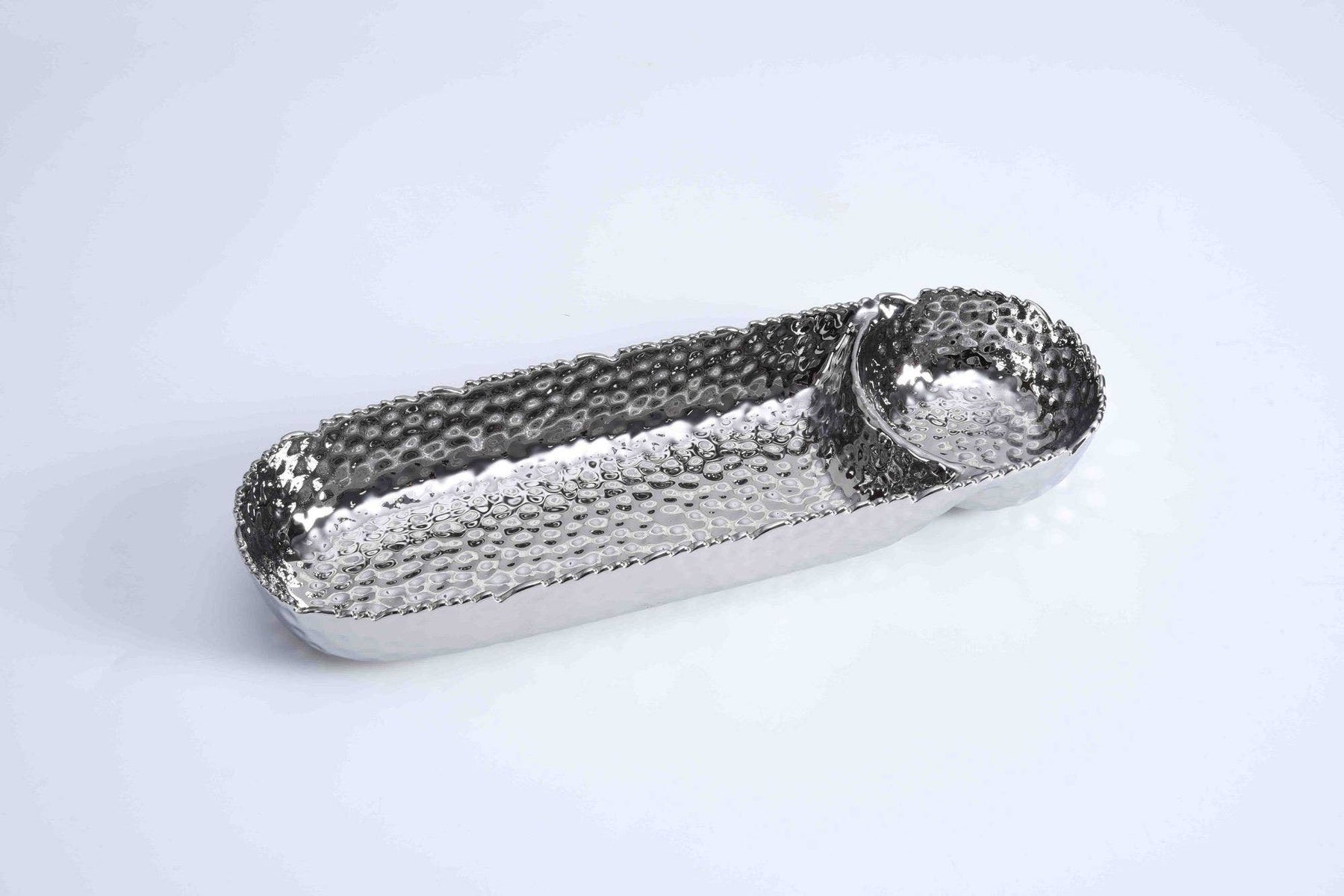 Chip & Dip from the Millennium Collection. Perfect for any dip combo – hummus and pita, salsa and tortilla chips, veggies and ranch or our favorite berries and whipped cream! This piece also makes a stunning display for sushi and soy sauce or crab cakes and tartar sauce. Striking and elegant silver tone titanium finished high-fired porcelain. Food safe, tarnish free, dishwasher safe, oven safe to 550°. Easy Care.