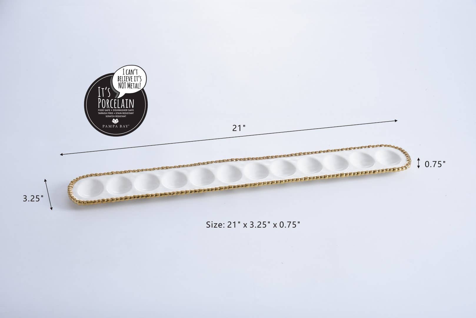 Deviled Egg Tray from the Golden Salerno Collection. The perfect accompaniment to relaxed weekend brunches, annual Easter celebrations or a fun night in, our egg tray is a great centerpiece for more than just eggs! Use to display a dozen deviled eggs at brunch or your beautifully decorated Easter eggs. This tray also makes for a great sushi display for a fun night in. Chill in the refrigerator first to keep food fresh and tasty when served. Striking and elegant titanium finished high-fired porcelain. Dishwasher safe, stain resistant, tarnish free, oven safe to 550°. Tarnish and stain-free. Easy Care.