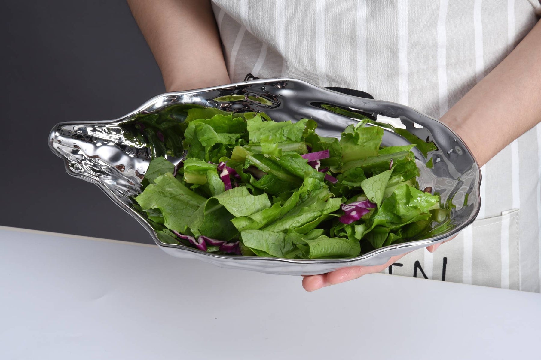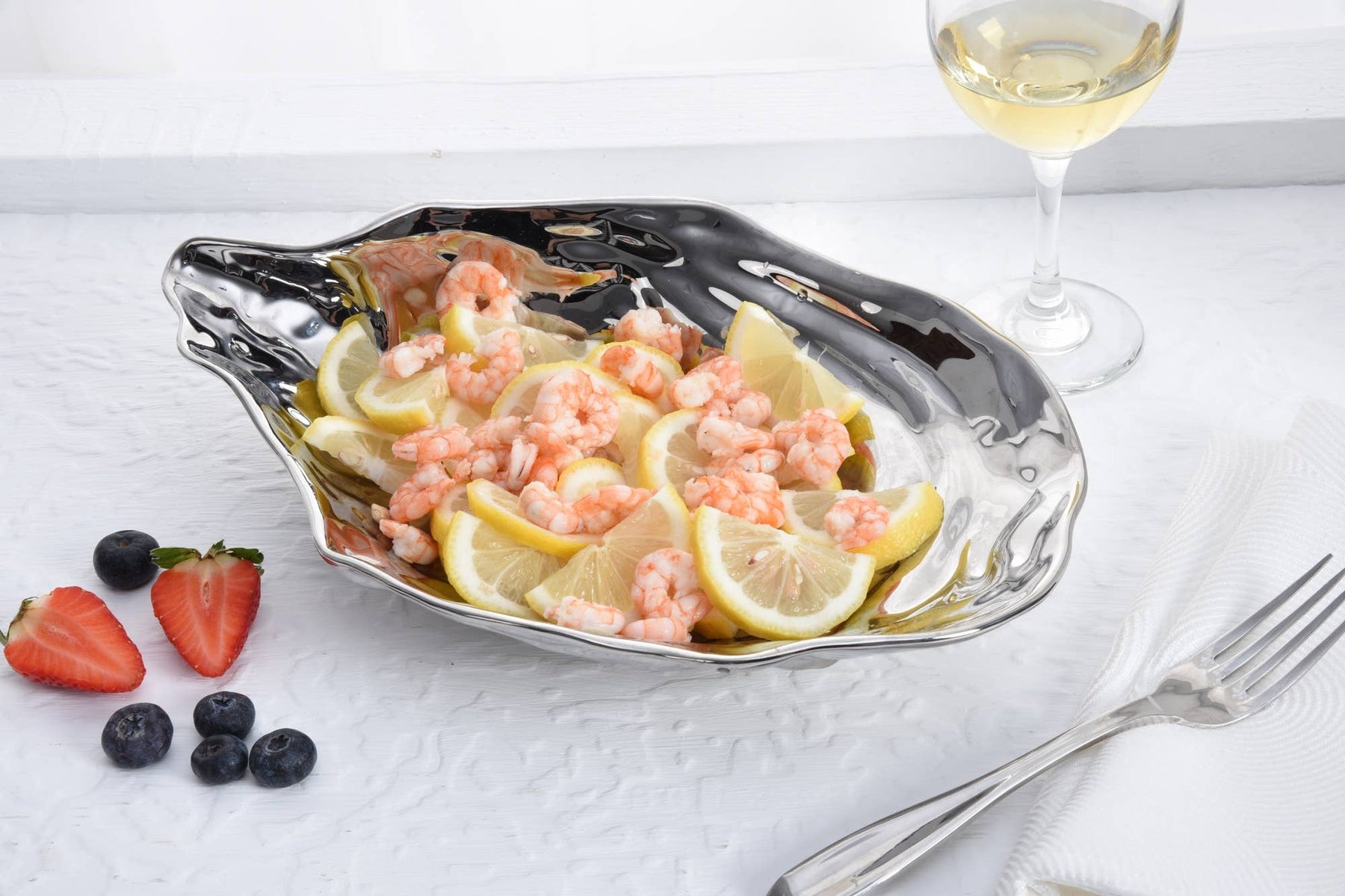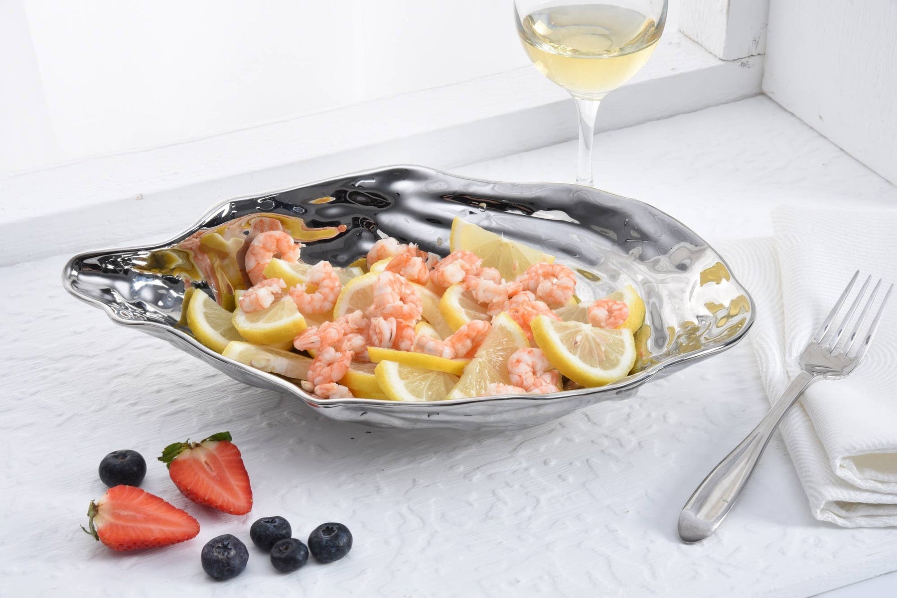 Large Oyster Bowl in versatile titanium. Gorgeous natural shape of an oyster in a timeless and spectacular silver toned finish is sure to amaze. Great for serving seafood favorites like shrimp, seafood salad, steamers or mussels (moules). Or use it for guests to discard their empty clam/mussel shells! Striking and elegant silver titanium high-fired porcelain. Food safe, dishwasher safe, tarnish and stain free. Easy Care.