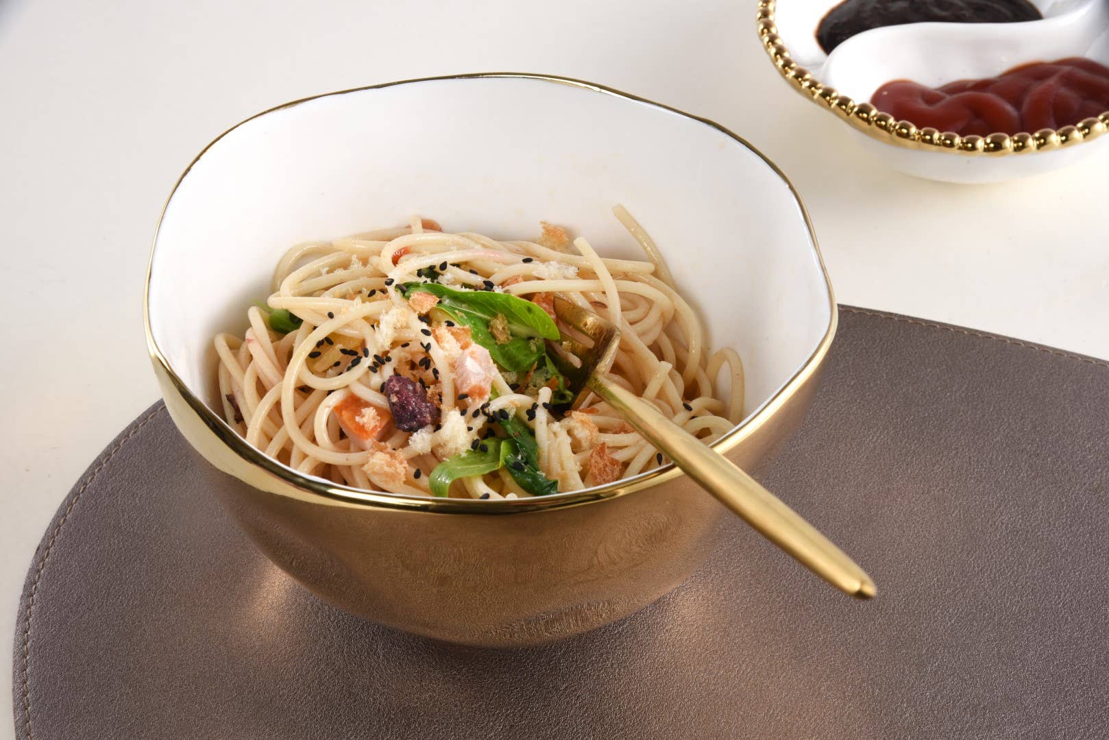 Medium Bowl from our Moonlight Collection. Whatever you are serving, it will look even more appetizing in this beautiful bowl! Perfect for salads, chips, or dips. Crafted in a stunning white high-fired porcelain with gold titanium. Food safe, dishwasher safe, oven safe to 550°. Tarnish and stain-free. Easy Care.