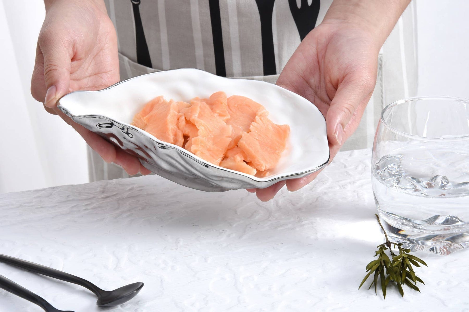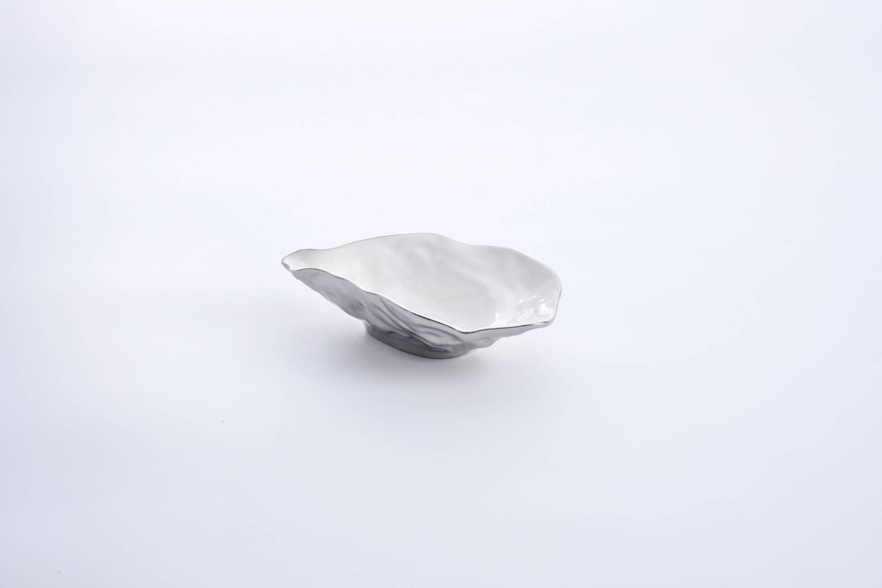 Small Oyster Bowl in white porcelain with titanium exterior. Gorgeous natural shape of an oyster in a timeless and classic color combo is sure to amaze. Great for serving seafood favorites like shrimp, seafood salad, smoked trout paté and whitefish salad. Use as a sauce dish for butter or soy sauce to accompany your favorite seafood fare! Striking and elegant silver titanium high-fired porcelain with gleaming white interior. Food safe, dishwasher safe, tarnish and stain free. Easy Care.