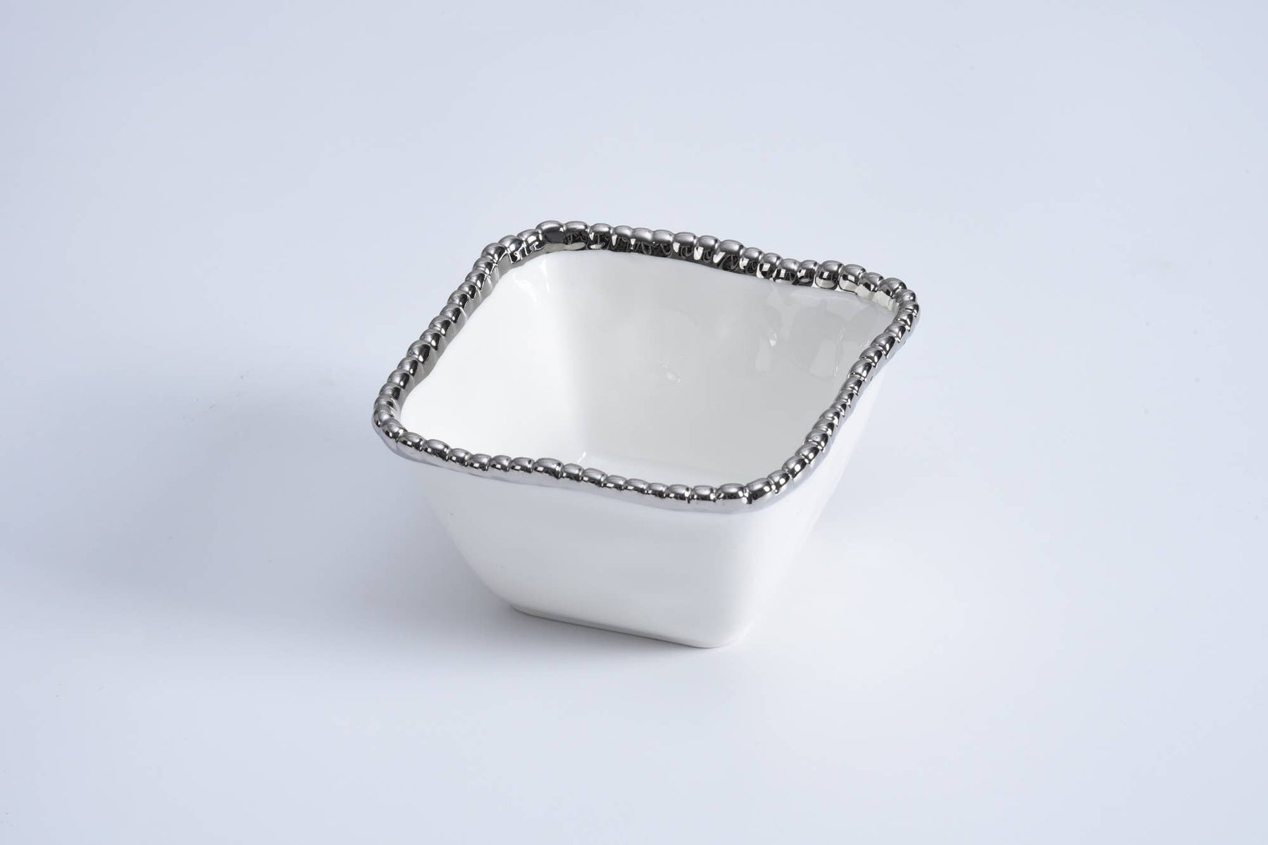 Square Snack Bowl from our Salerno Collection. Great for individual snacking, dips or for toppings for a make-your-own taco, sundae or pizza night! A perfect addition to any bar for lemons and limes. Gleaming white porcelain with lustrous silver beads in titanium. Food safe, tarnish free, dishwasher safe, oven safe to 550°. Easy Care.