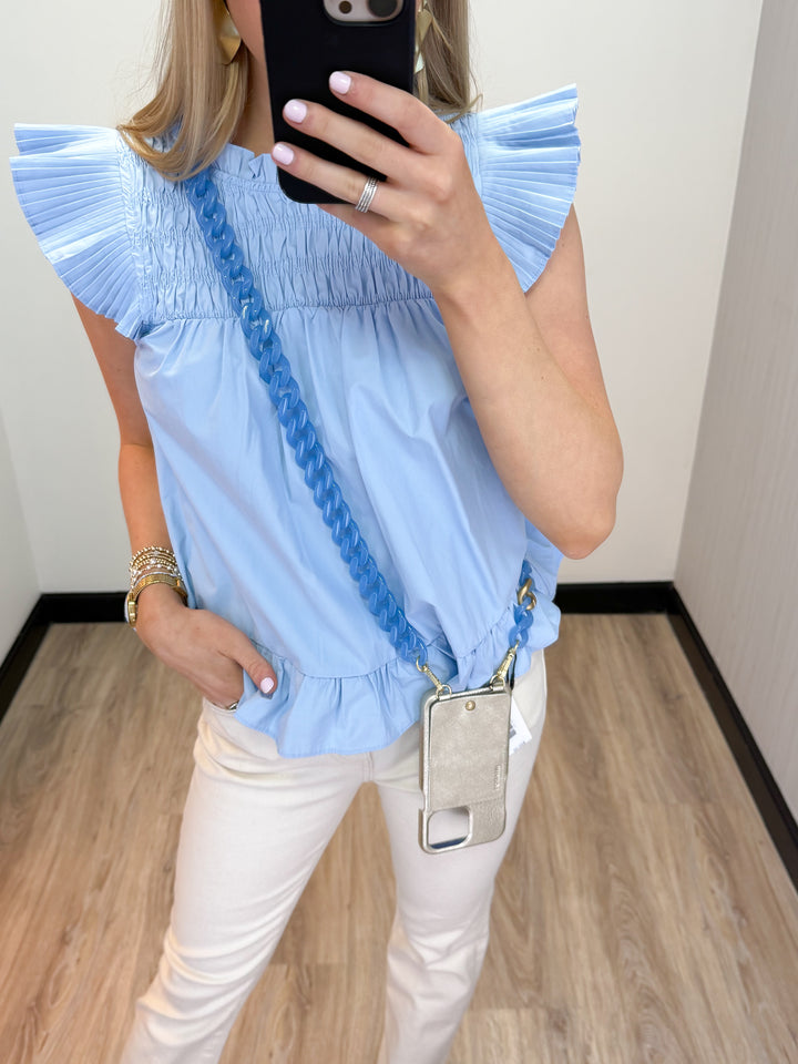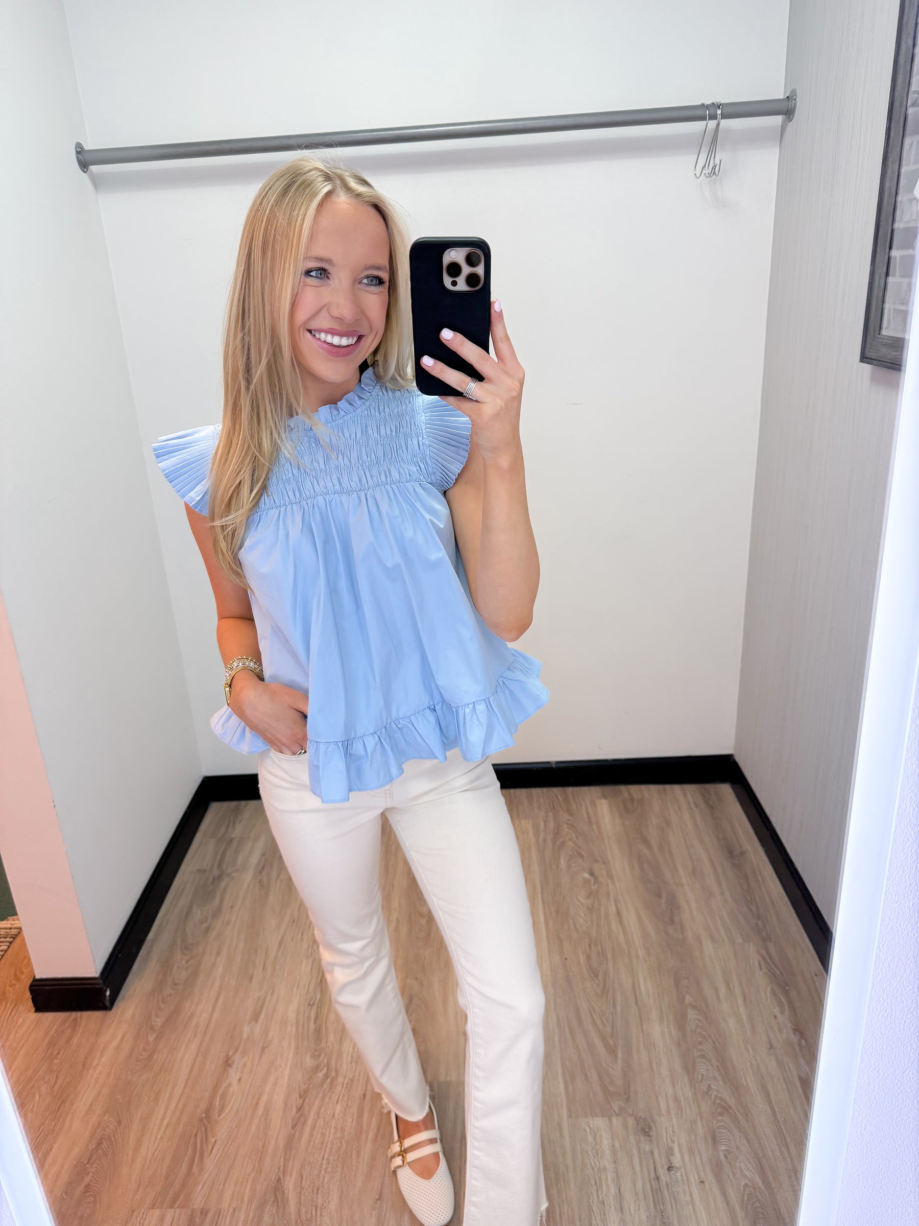 Introducing our Meet Me in Santorini Skyline Serenity Top, a must-have addition to your spring wardrobe. This gorgeous light blue top exudes effortless style and tranquility, perfect for any occasion.  Elevate your look with this easy going top into warm weather.