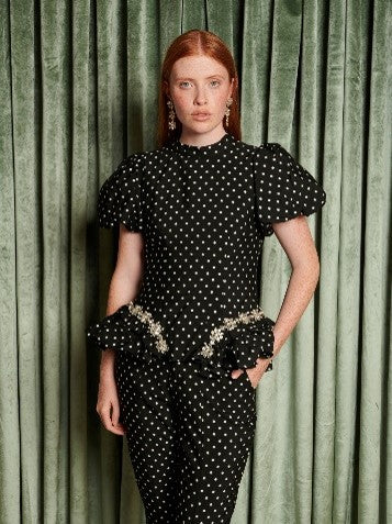 Fitted top in a polka dot jacquard fabric. Detailed with gathered side ruffles and gem trim. Fully lined.