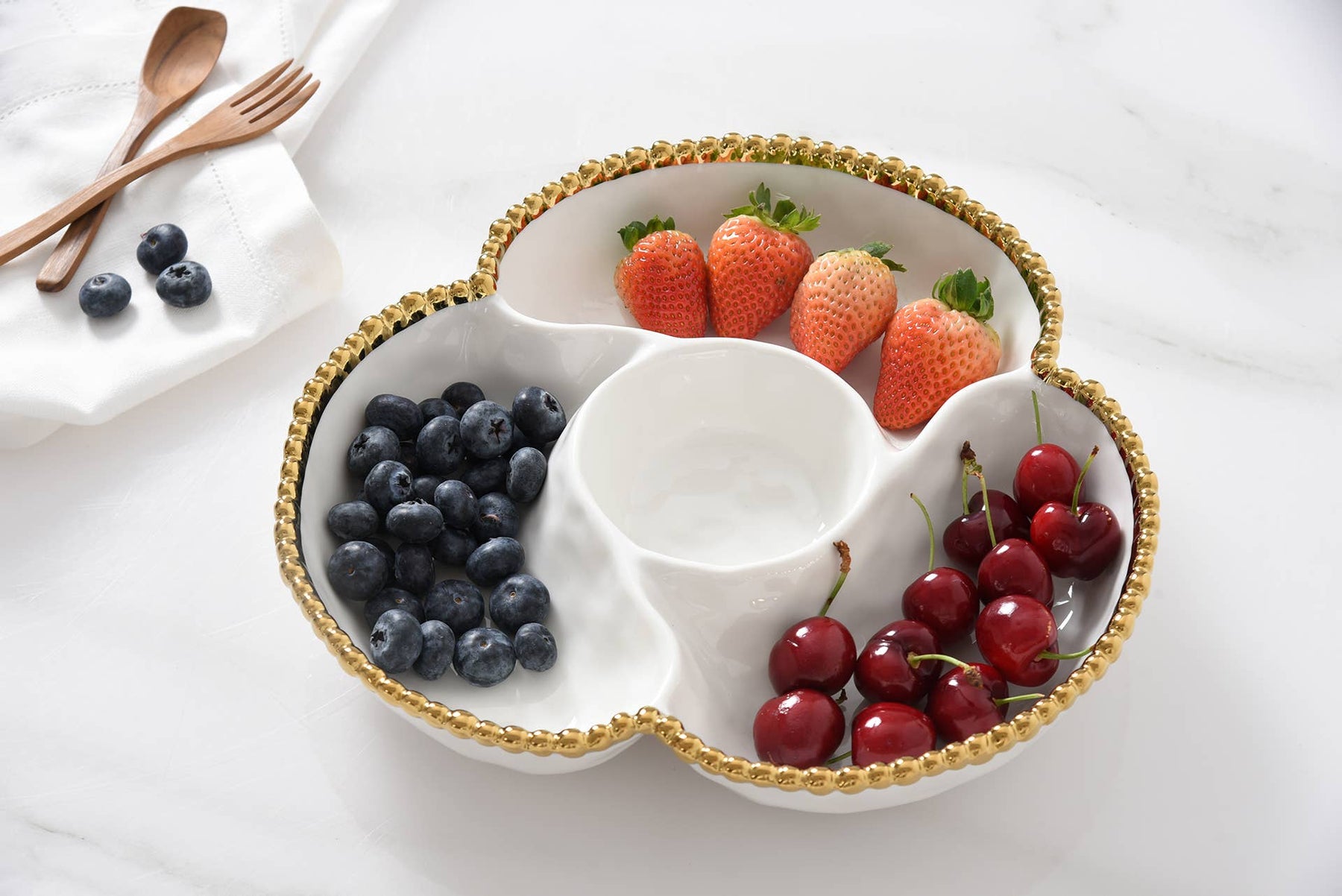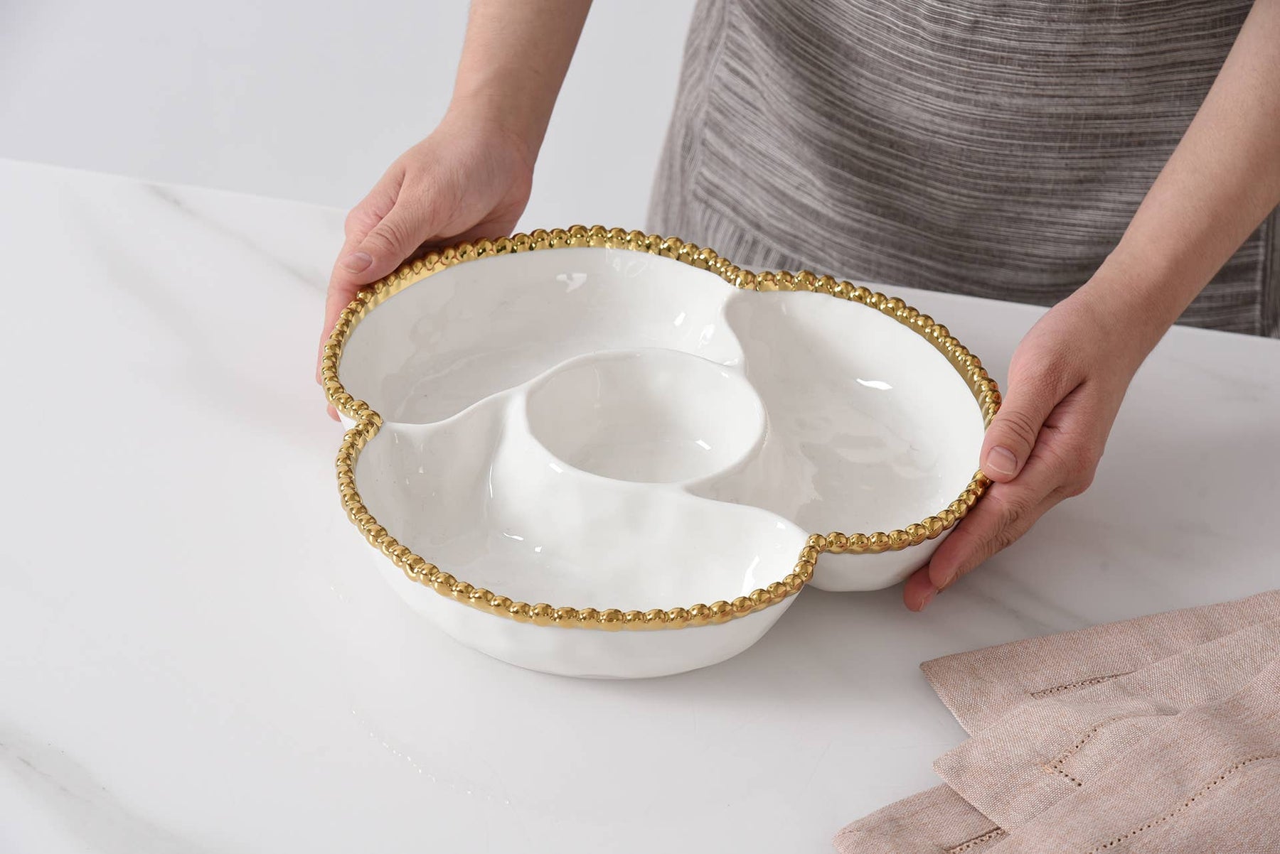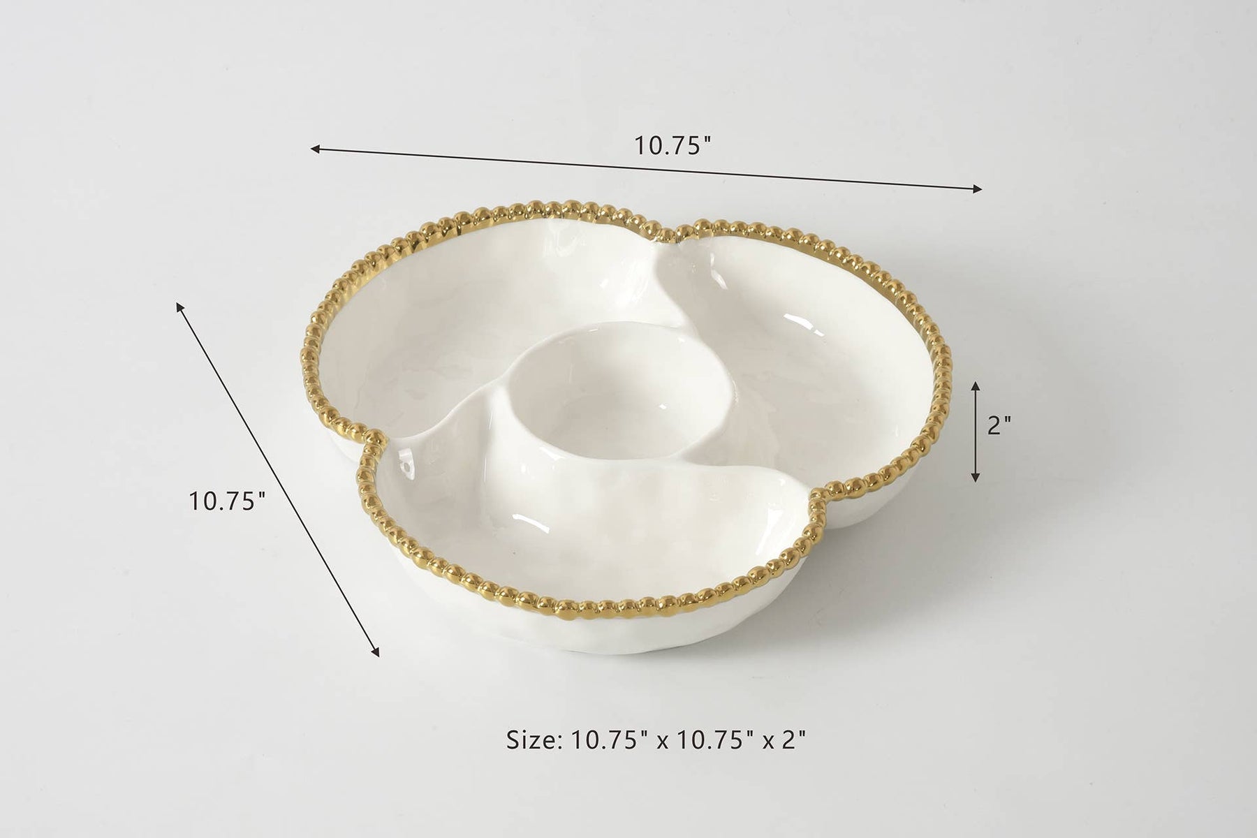 4 Section Server from the Golden Salerno Collection. Great for appetizers, tapas and antipasto. Or use for toppings for a make-your-own sundae, taco or pizza night – the options are endless! Gleaming white porcelain with lustrous gold beads. Food safe, dishwasher safe, oven safe to 500°. Tarnish and stain-free. Easy Care.