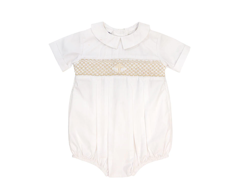 Special days call for the most special outfits. Our one-piece white Christening dressy bubble features ivory embroidery, a Peter-Pan collar, and gentle pleats. Subtle buttons help with easy dressing and changing, while its soft material will keep your little one comfy for all-day celebrations.