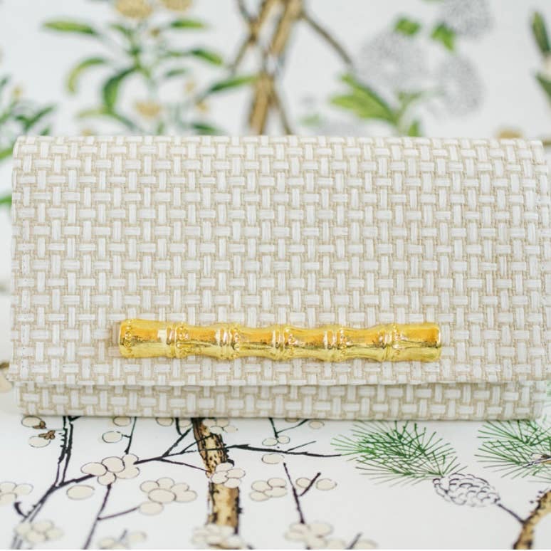 Effortlessly transition from work to play with the Lulu Clutch! Crafted from Thibaut basket weave grasscloth, the clutch is lined with crisp white linen. It measures 10" x 5" and contains accordion sides for maximum storage.  The expandable accordion sides provide extra carrying capacity for essentials, as well as grommets for an included chain. Finished with a secure magnetic snap closure, the Lulu Clutch is a practical yet chic choice for the modern, discerning shopper.