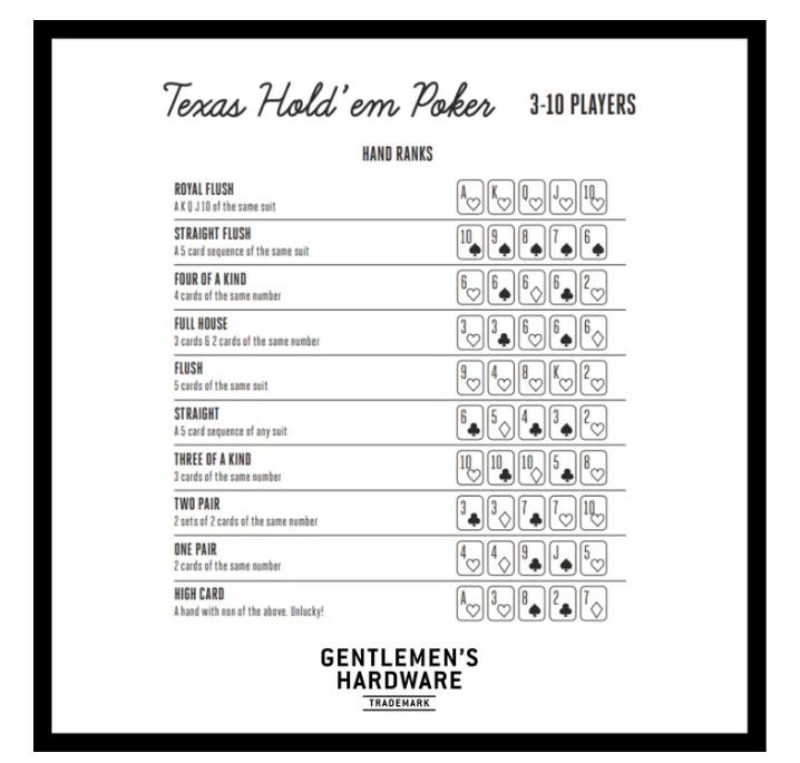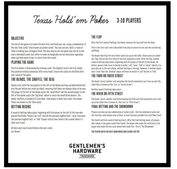 Go all-in! Each all-weather playing card comes fully illustrated with a different survival tip or fact, ideal for pit stops in the great outdoors. Stowed in a compact, transportable tin with full instructions for Texas Hold'em!