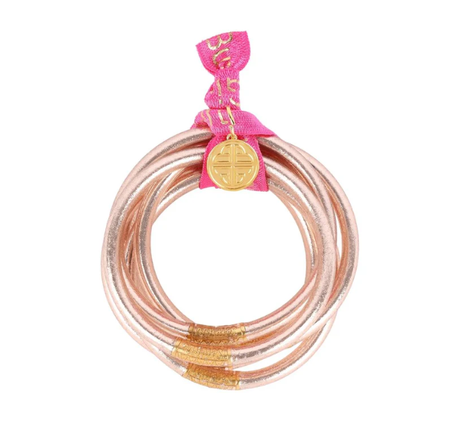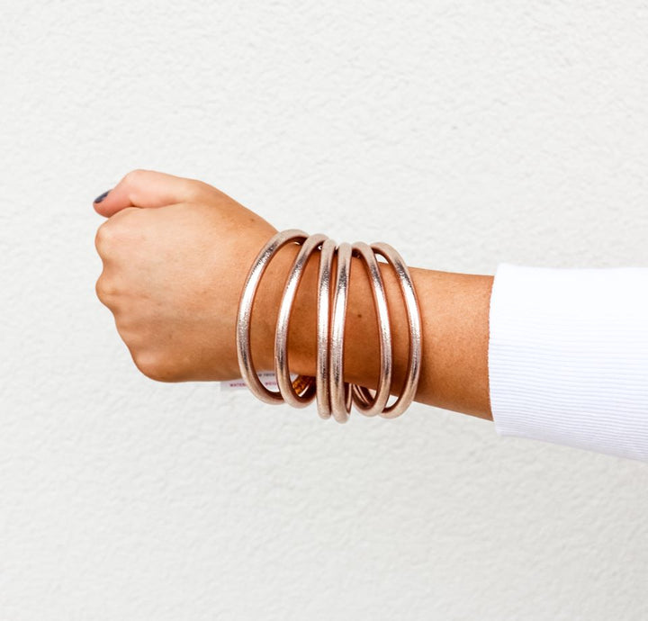 These Champagne All Weather BuDhaGirl Bangles are a favorite to have that are soundless, lightweight, and accessorize your look perfectly!