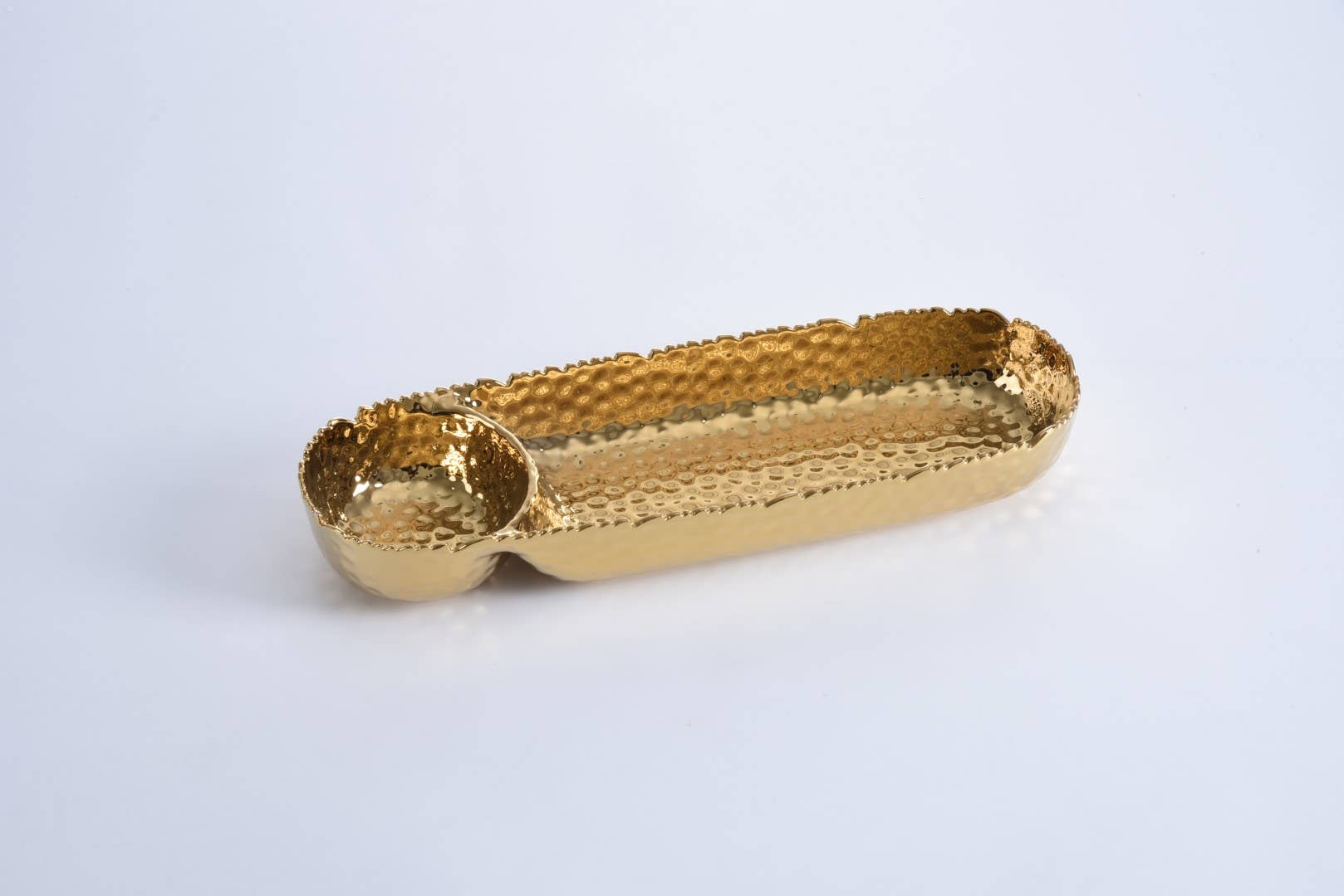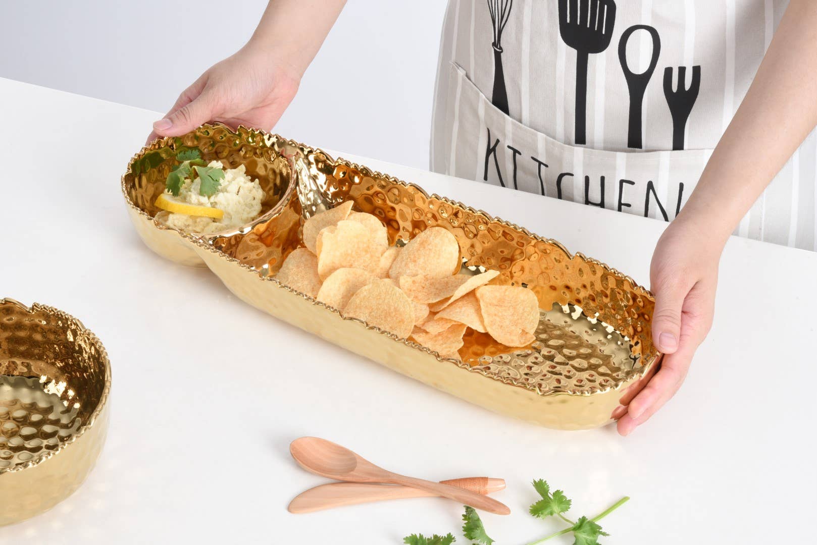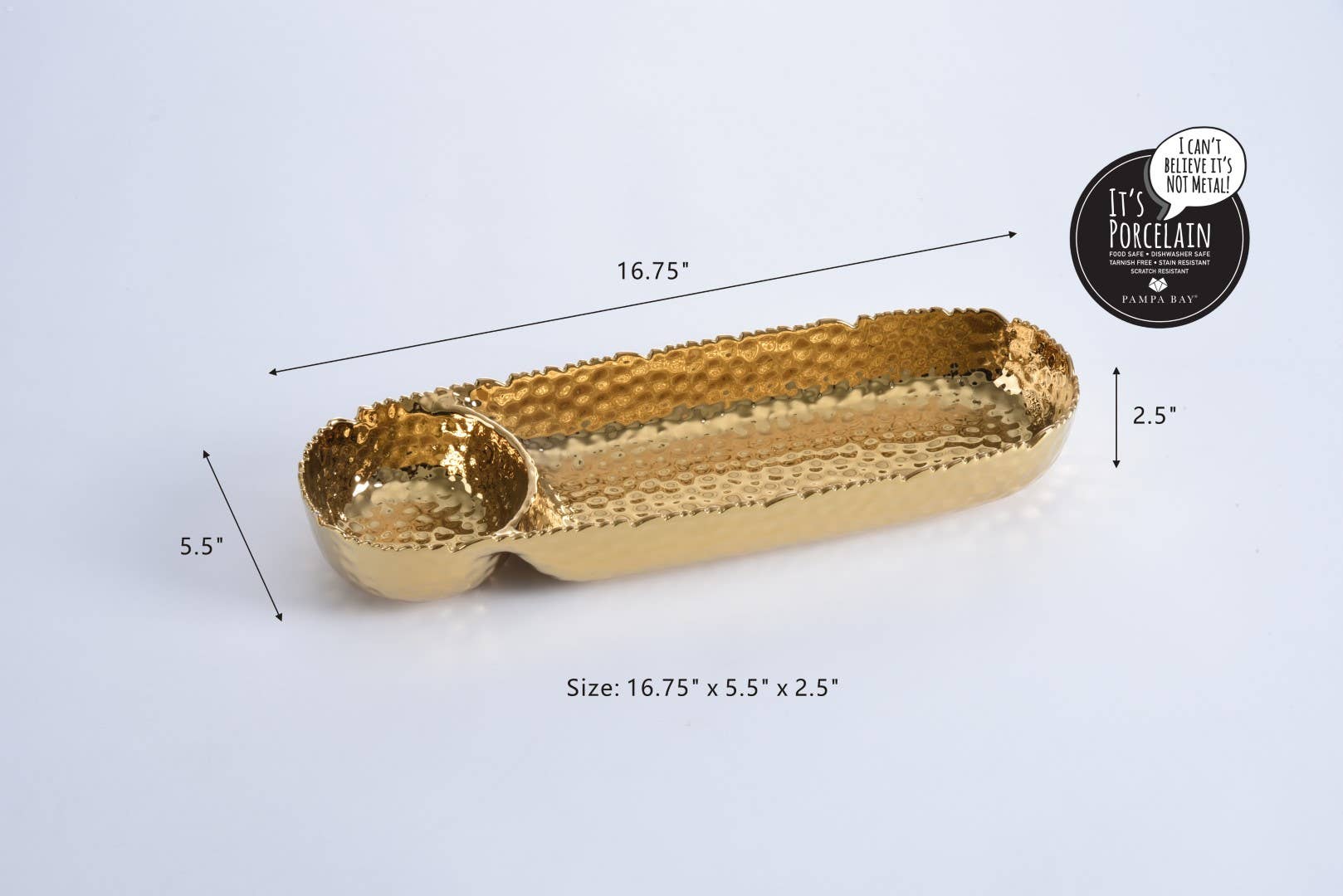 Chip & Dip from the Golden Millennium Collection. Perfect for any dip combo – hummus and pita, salsa and tortilla chips, veggies and ranch or our favorite berries and whipped cream! This piece also makes a stunning display for sushi and soy sauce or crab cakes and tartar sauce. Striking and elegant gold tone titanium finished high-fired porcelain. Food safe, tarnish free, dishwasher safe, oven safe to 550°. Easy Care.
