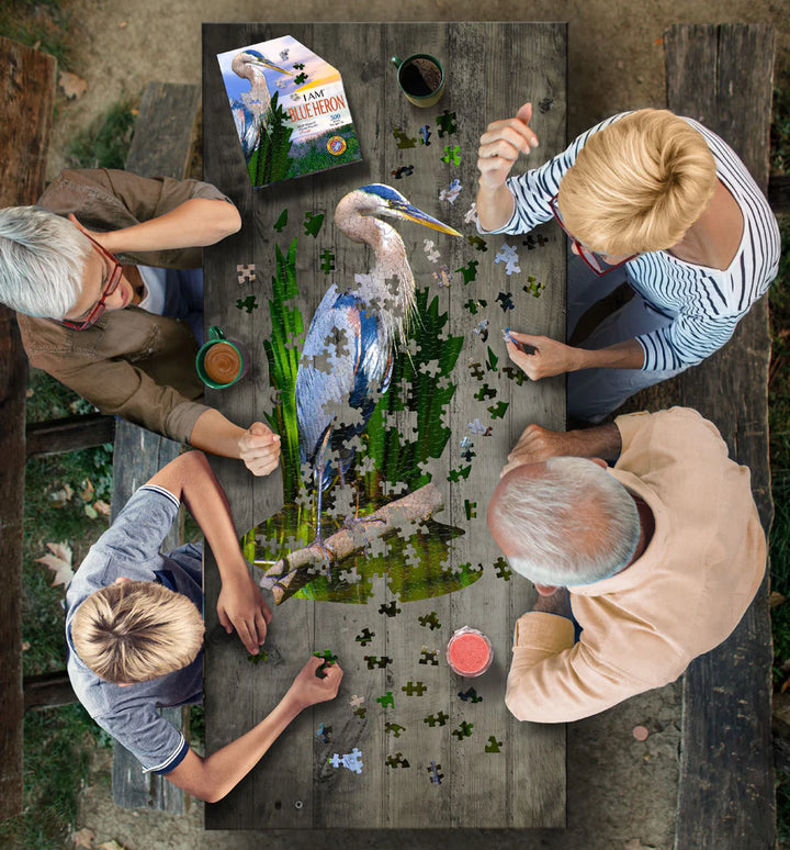 Each puzzle comes with an educational Madd Capp Fun Facts booklet. On one side is a fold-out puzzle image to hang as a poster or use as a reference. The flipside is chock-full of cool information! Did you know, for instance, that blue herons can be spotted at all hours, wading alone through shallow waters, stalking their prey? Best to sleep with one eye open … blue herons have excellent night vision and will spear anything within striking distance!