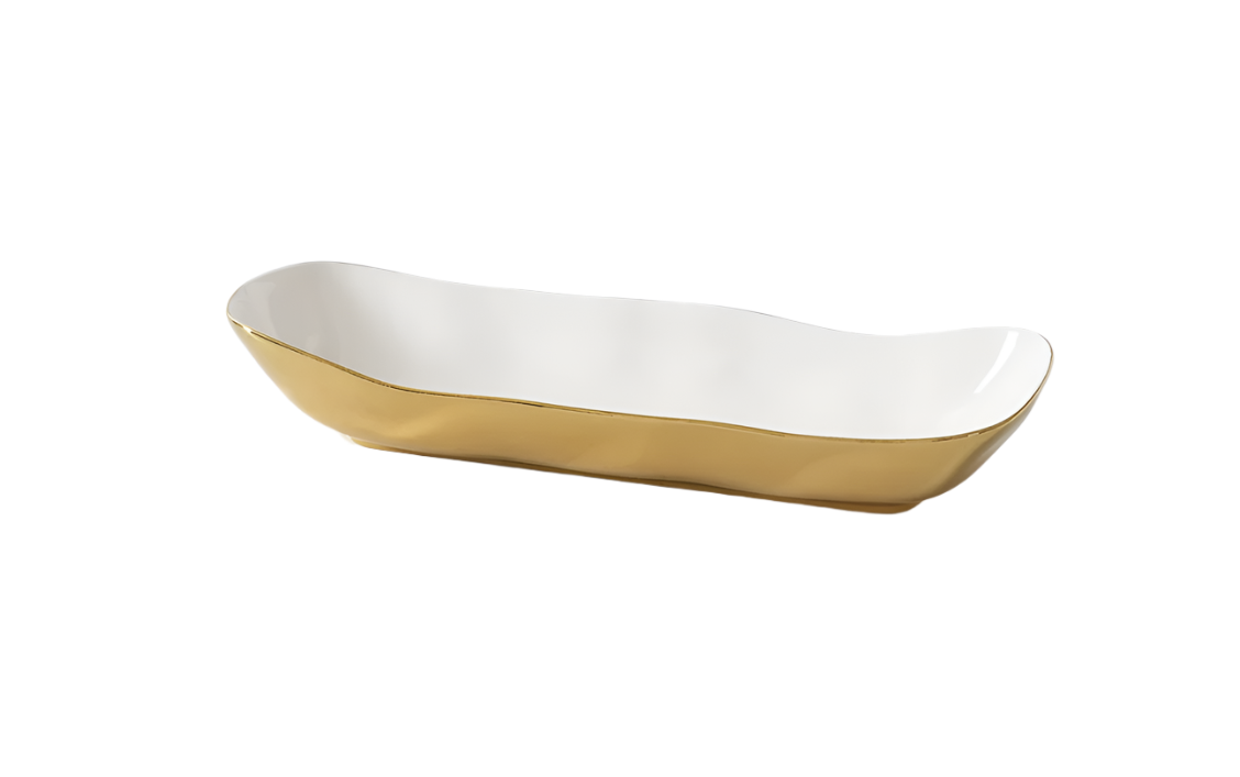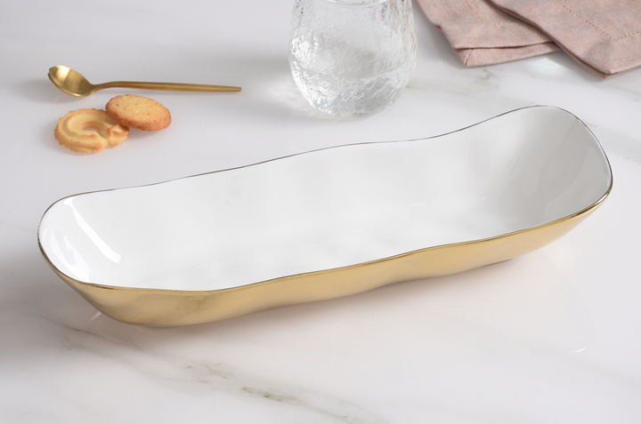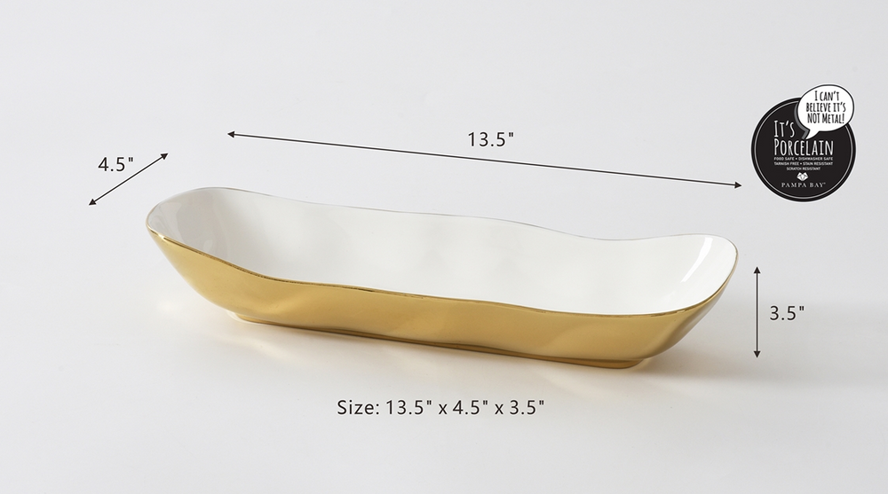 Deep Rectangular Server from our Moonlight Collection. Perfect for presenting bread, asparagus, green beans, crackers, or cookies. Looks great as a decorative accessory with fresh fruits or lemons! Crafted in a luxurious white high-fired porcelain and dazzling gold exterior. Food safe, dishwasher safe, oven safe to 500°. Tarnish and stain-free. Easy Care.