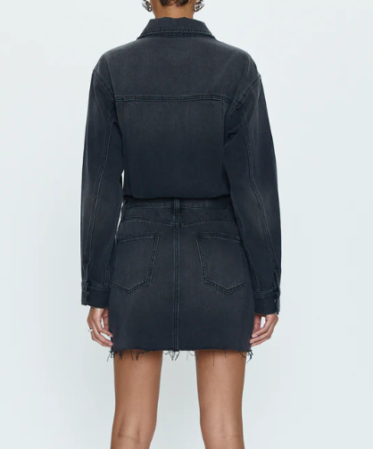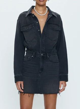 This denim-on-denim dress features a long-sleeved button-up top that flows into a raw hem mini skirt. In a true nonstretch denim fabric, the functional pockets and belt loops.