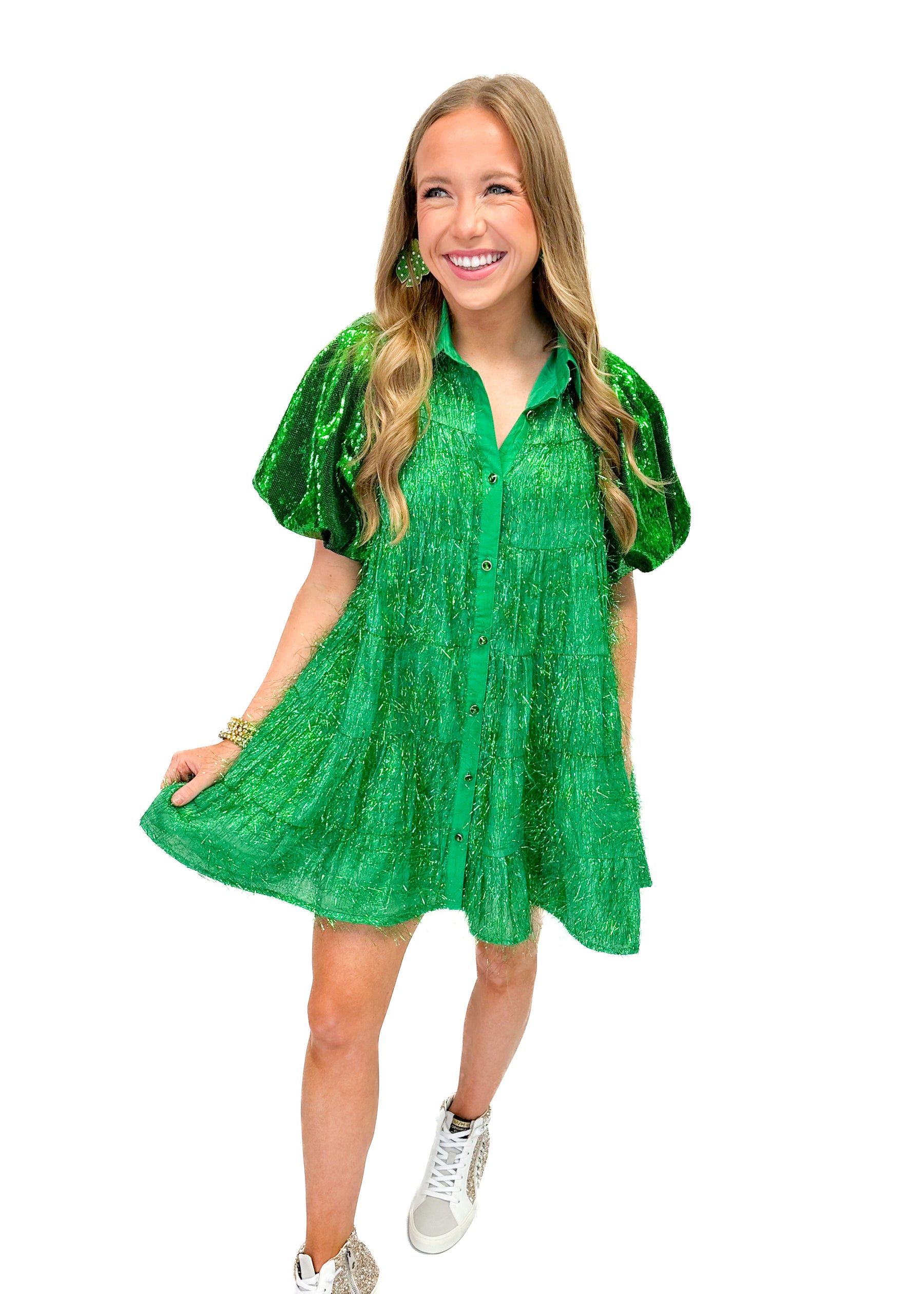 Queen of Sparkles Green Tinsel Sequin Sleeve Dress